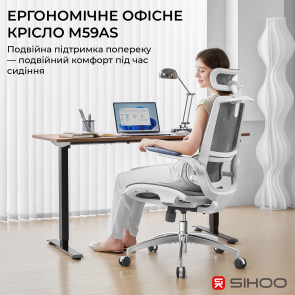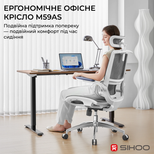 Sihoo M59AS — сучасне ергономічне офісне крісло, створене для максимального комфорту під час тривалого сидіння — роботи з комп’ютером, навчання або ігор. Завдяки продуманій конструкції та регульованим елементам ця модель забезпечує всебічну підтримку тіла, зменшуючи навантаження на спину, шию та плечі.