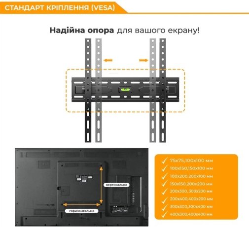 Brateck KL36-44T сумісний із широким спектром стандартів VESA — від 75x75 до 400x400 мм, що гарантує сумісність практично до всіх моделей телевізорів у зазначеному діапазоні розмірів. Така універсальність разом із простотою монтажу робить цей кронштейн одним із найкращих рішень у своєму класі.