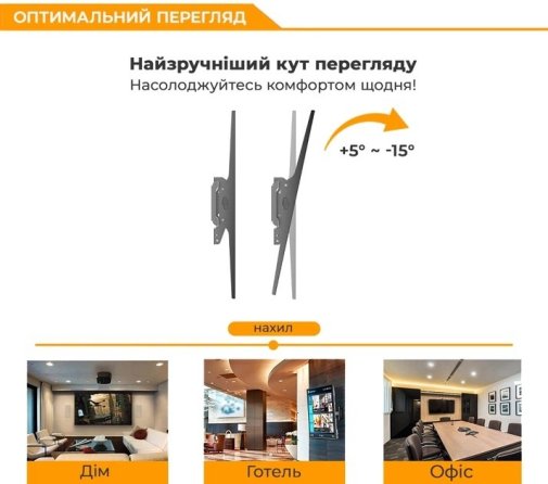 Кронштейн оснащений функцією нахилу в діапазоні від +5° до -15°, що дає змогу легко налаштувати оптимальний кут огляду залежно від висоти розміщення та положення глядача. Це особливо зручно в приміщеннях, де телевізор встановлюється вище рівня очей.