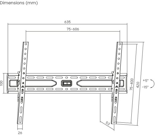 Кронштейн оснащений функцією нахилу в діапазоні від +5° до -15°, що дає змогу легко налаштувати оптимальний кут огляду залежно від висоти розміщення та положення глядача. Це особливо зручно в приміщеннях, де телевізор встановлюється вище рівня очей.