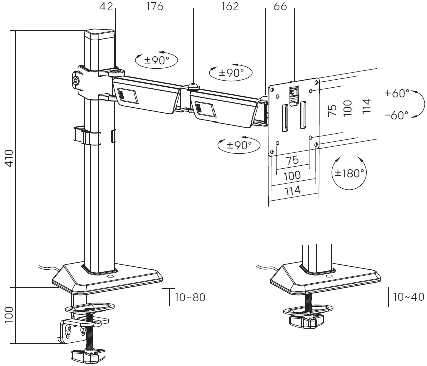 Кріплення забезпечує гнучке налаштування: нахил екрана вперед/назад у межах ±60°, поворот на ±90° та обертання на 180° для портретної або ландшафтної орієнтації. Система швидкого з’єднання VESA спрощує встановлення та зняття монітора без використання інструментів.