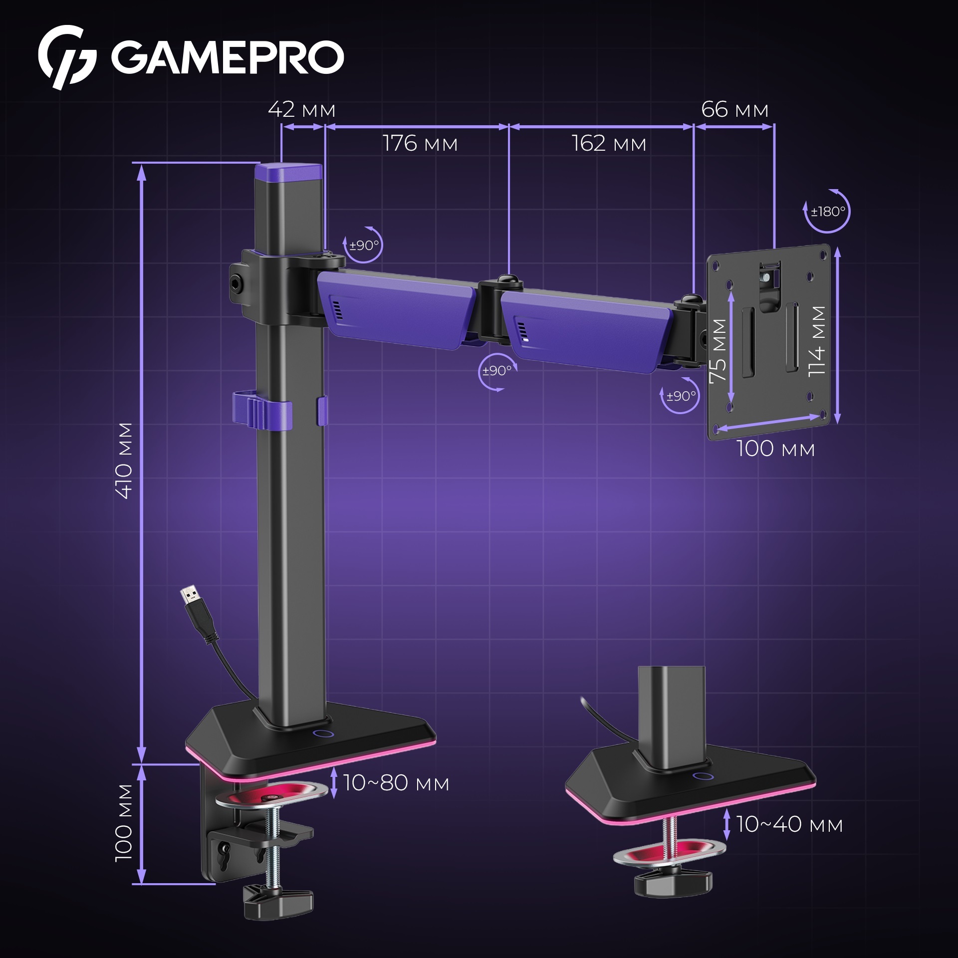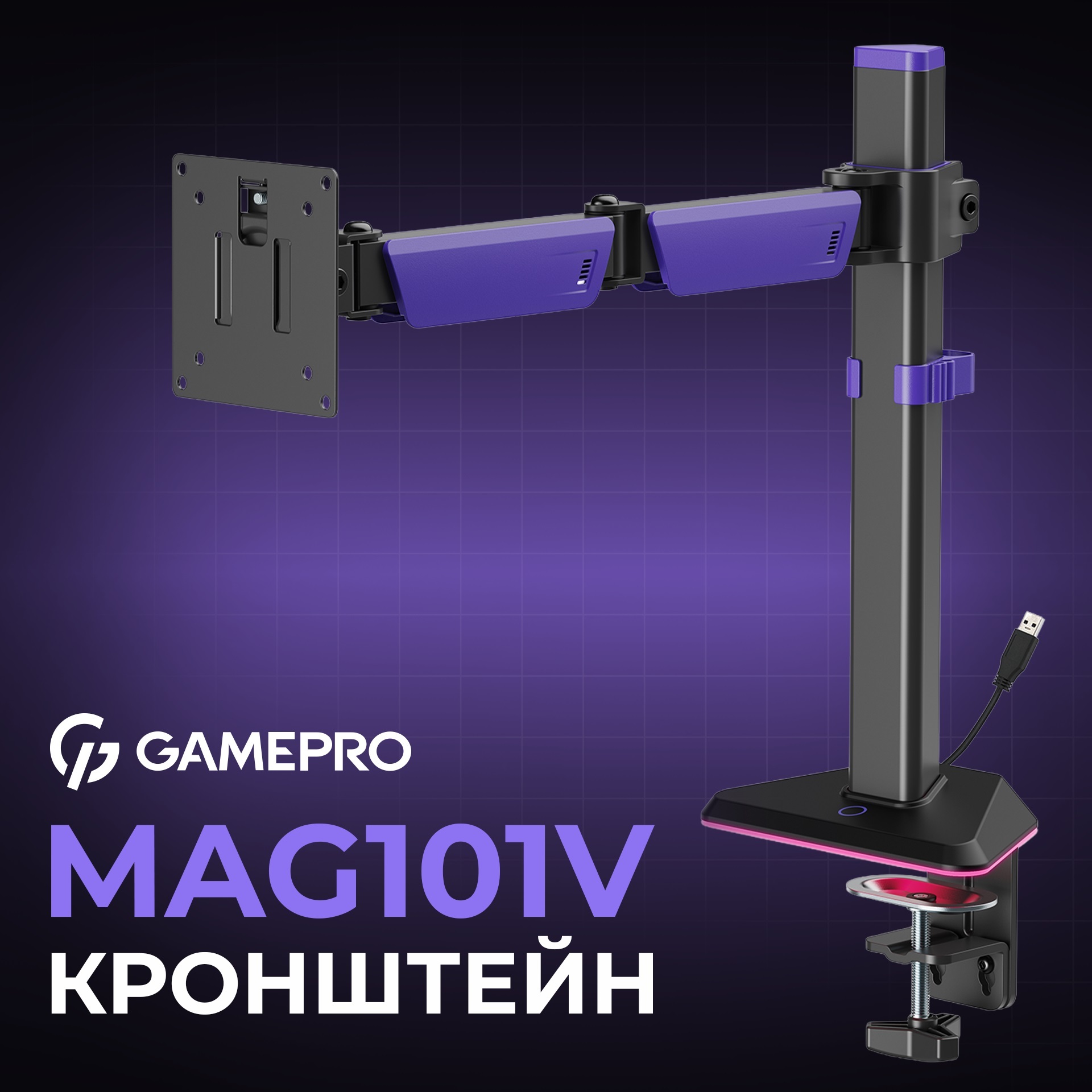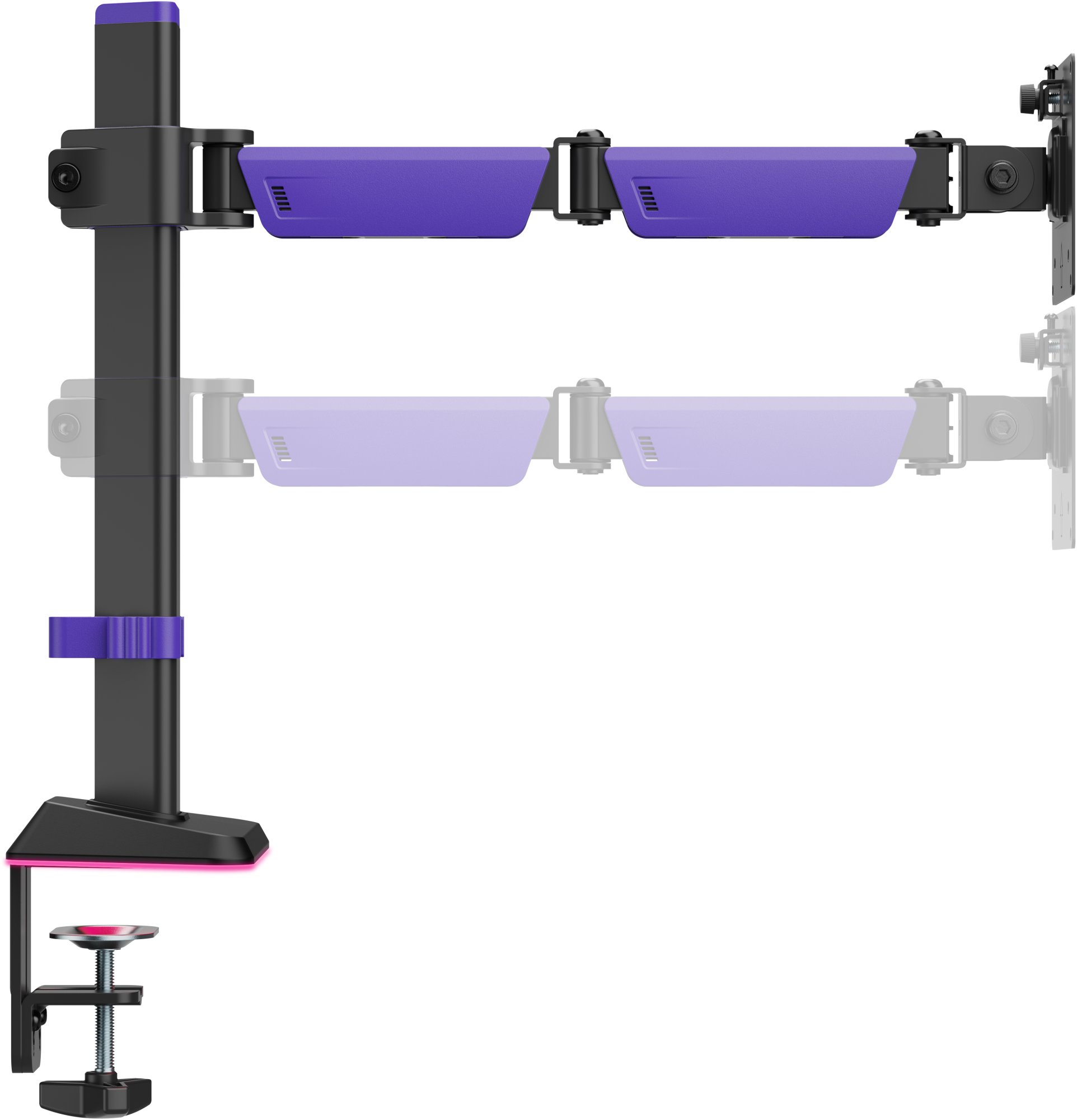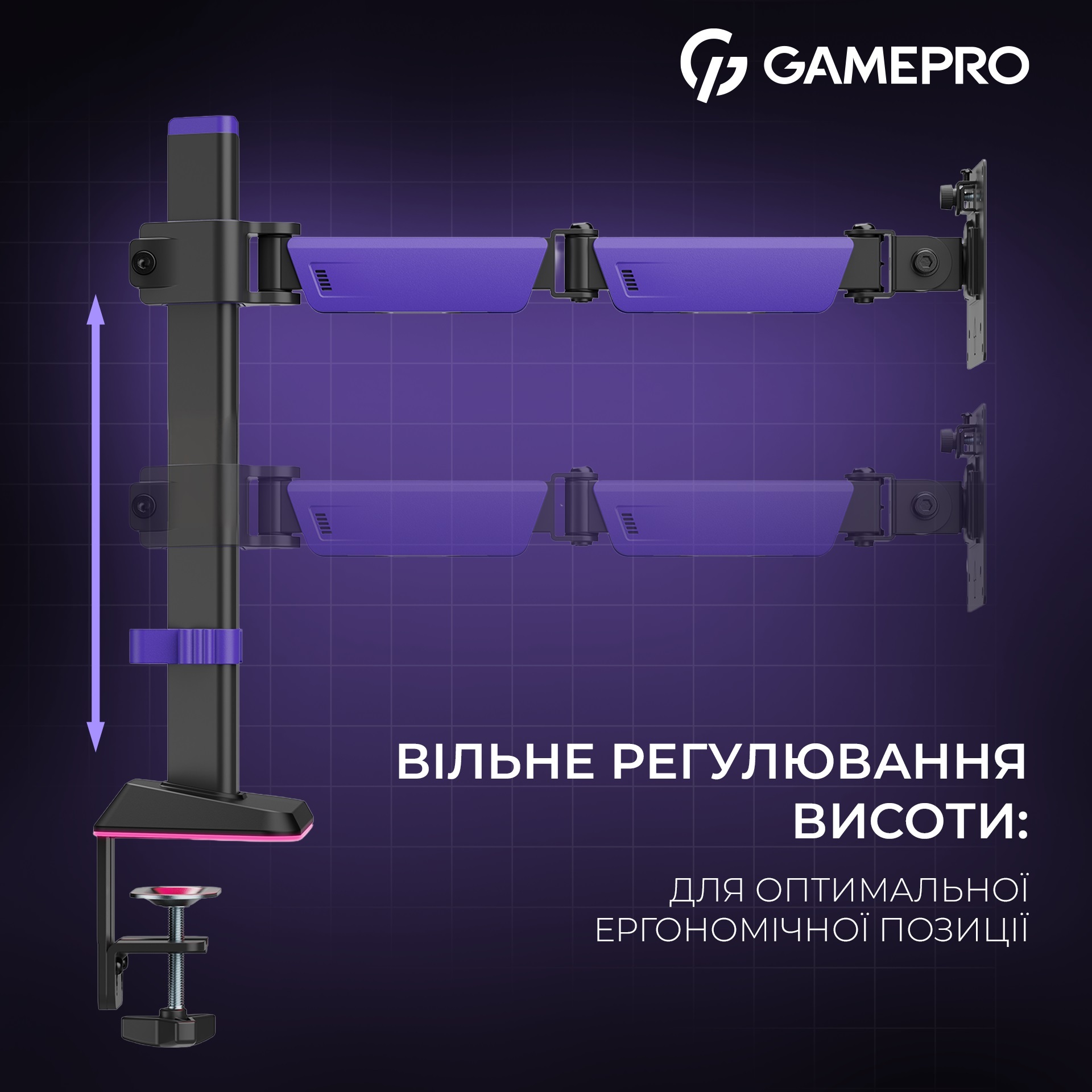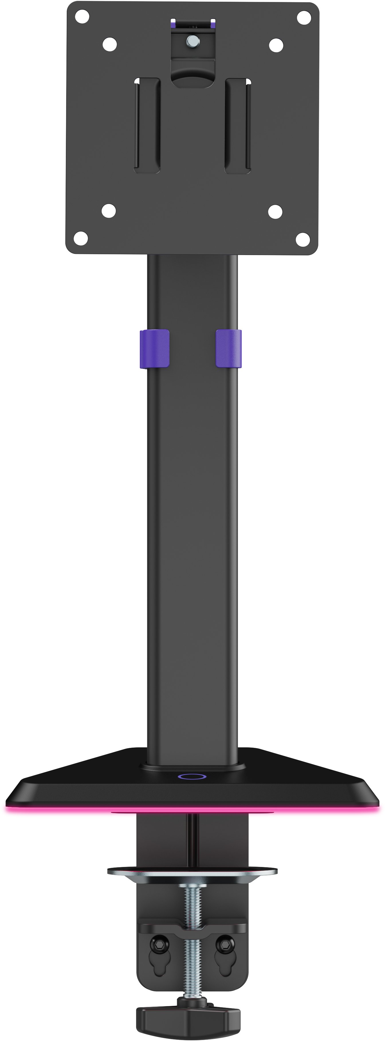 Основа кріплення оснащена RGB-підсвічуванням, яке створює ефектну геймерську атмосферу, а режими підсвічування легко перемикаються за допомогою кнопки. Кріплення фіксується до стільниці за допомогою струбцини (для столів товщиною 10–80 мм) або через наскрізний отвір (для столів товщиною 10–40 мм). Вбудована система управління кабелями забезпечує охайність і порядок на робочому місці.