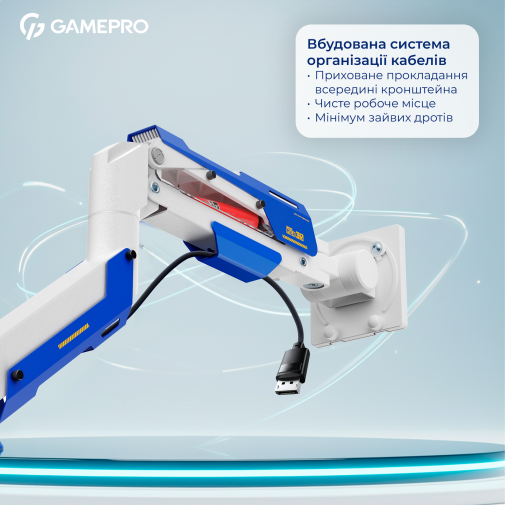 Вбудована система керування кабелями дозволяє підтримувати робочий простір в порядку, приховуючи дроти та забезпечуючи чистоту на робочому столі. Gamepro MAG701WBL — це ідеальне рішення для тих, хто цінує ергономіку, надійність і естетику в організації робочого місця, хоче звільнити простір на столі та отримати повну свободу у регулюванні положення монітора.