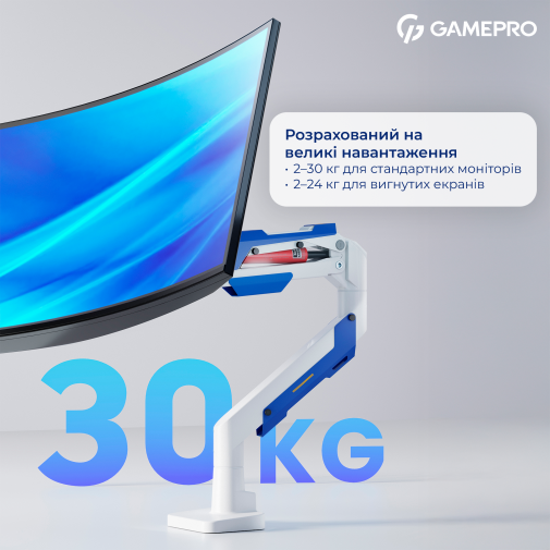 Настільне кріплення для монітора GamePro MAG701WBL — це високоякісне ергономічне рішення для робочого або ігрового простору, яке дозволяє легким рухом налаштовувати положення великого монітора відповідно до вашого зору та стилю роботи. Надзвичайно міцна конструкція з використанням алюмінію, сталі та пластику забезпечує надійну підтримку дисплеїв вагою до 30 кг, що робить цей кронштейн ідеальним для великих плоских та вигнутих екранів діагоналлю від 24″ до 57″.