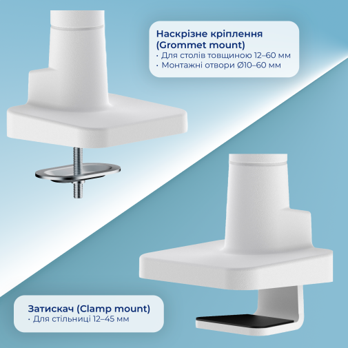 Кронштейн підтримує розширену кількість стандартів VESA (75×75, 100×100, 100×200, 200×100, 200×200), що робить його сумісним з більшістю сучасних моніторів на ринку. Конструкція також передбачає знімну VESA-панель, що значно спрощує монтаж: монітор кріпиться на панель, а потім легко встановлюється на кронштейн. MAG701WBL можна встановити як за допомогою кріплення-затискача, так і через спеціальний наскрізний отвір в стільниці, що робить його універсальним варіантом для різної товщини та типу столу.