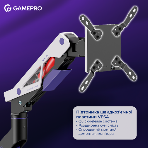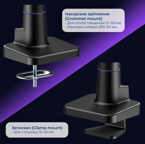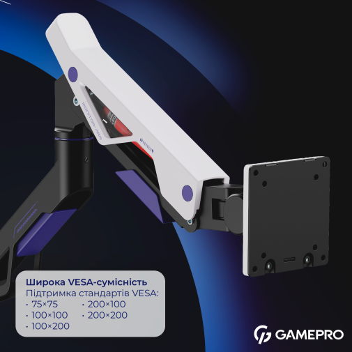 Розширена сумісність із стандартами VESA 75×75, 100×100, 100×200, 200×100 і 200×200 мм гарантує просту установку переважної більшості сучасних моніторів. Вбудований механізм швидкого від'єднання VESA-пластини робить процес установки монітора ще простішим і зручнішим. Монтаж здійснюється через надійну струбцину або наскрізне кріплення, яке дозволяє закріпити кронштейн на стільниці різної товщини.