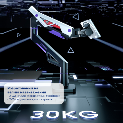 Модель оснащена системою керування кабелями, що допомагає підтримувати робоче місце в порядку без зайвих проводів на столі. Кріплення підтримує як плоскі, так і вигнуті монітори, а вага та параметри конструкції гарантують стабільність і відсутність вібрацій навіть для великих вигнутих екранів.