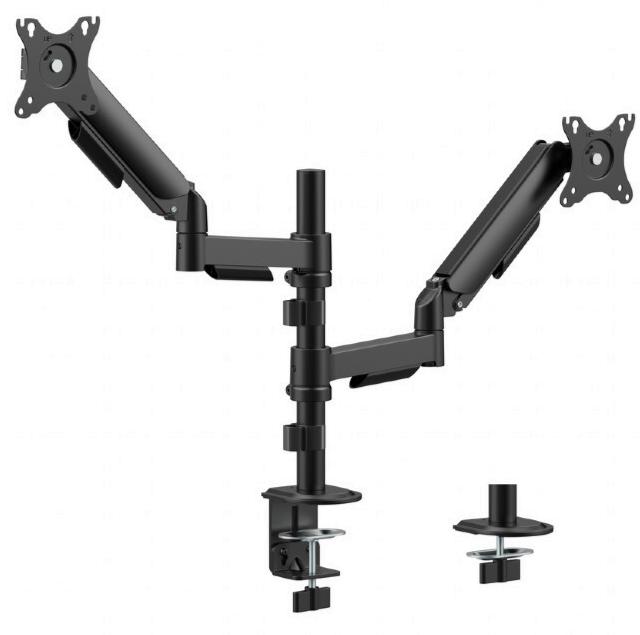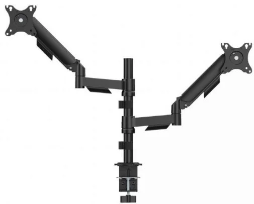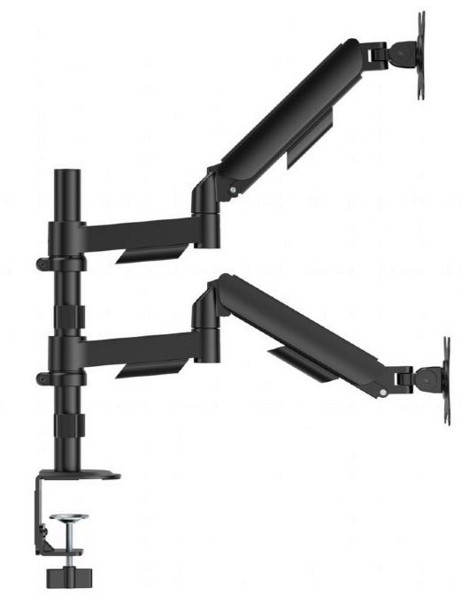 Ця модель у класичному чорному кольорі з матовим покриттям базується на металевій конструкції з порошковим покриттям, що гарантує стійкість до механічних навантажень і корозії, підтримуючи два монітори з діагоналлю від 17" до 32" дюймів та вагою до 9 кг кожен, перетворюючи потенційний хаос кабелів і поверхонь на упорядкований, візуально чистий простір, з VESA-стандартом 75x75 мм та 100x100 мм для широкої сумісності з моделями від Acer, Dell чи Samsung. З нахилом до 90° по вертикалі та поворотом до 90° по горизонталі, кронштейн дозволяє точно налаштувати кут огляду для зменшення відблисків і втоми очей, роблячи його незамінним для мультимоніторних конфігурацій чи геймерських сетапів, де кожен градус має значення.