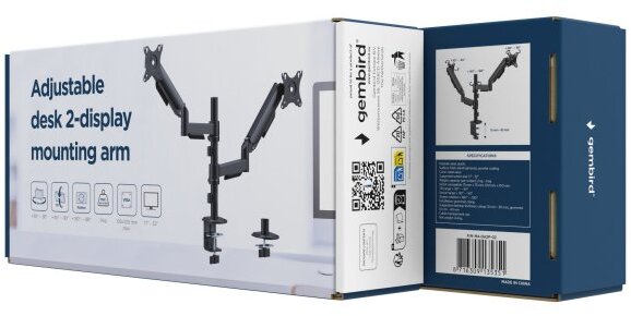 Gembird MA-DA2P-02- це оптимальне рішення для тих, хто цінує гнучкість, міцність і мінімалізм, де нахил 90° поєднується з поворотом 90° та обертанням на 180°, і простотою установки, перетворюючи стіл на ідеальну платформу для двох моніторів, забезпечуючи стабільну продуктивність у динамічному цифровому середовищі без зайвих витрат чи ускладнень.