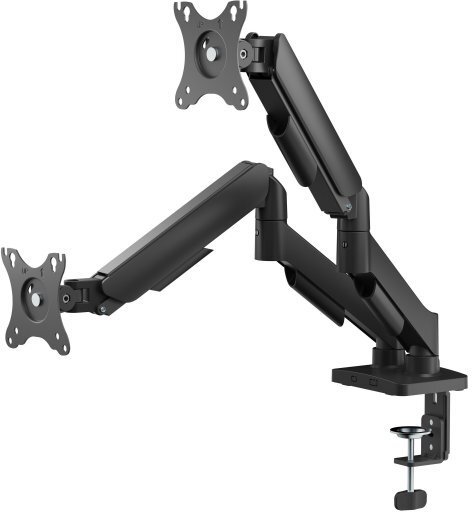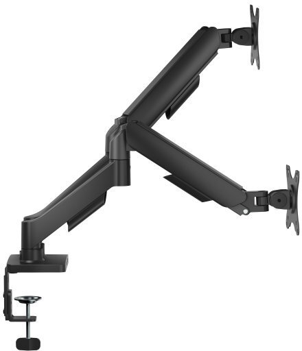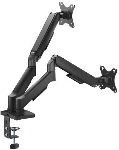Ця модель у класичному чорному кольорі з матовим покриттям базується на металевій конструкції з порошковим покриттям, що гарантує стійкість до механічних навантажень і корозії, підтримуючи два монітори з діагоналлю від 17" до 32" дюймів та вагою до 9 кг кожен, перетворюючи потенційний хаос кабелів і поверхонь на упорядкований, візуально чистий простір, з VESA-стандартом 75x75 мм та 100x100 мм для широкої сумісності з моделями від Acer, Dell чи Samsung. З нахилом до 90° по вертикалі та поворотом до 90° по горизонталі, кронштейн дозволяє точно налаштувати кут огляду для зменшення відблисків і втоми очей, роблячи його незамінним для мультимоніторних конфігурацій чи геймерських сетапів, де кожен градус має значення.