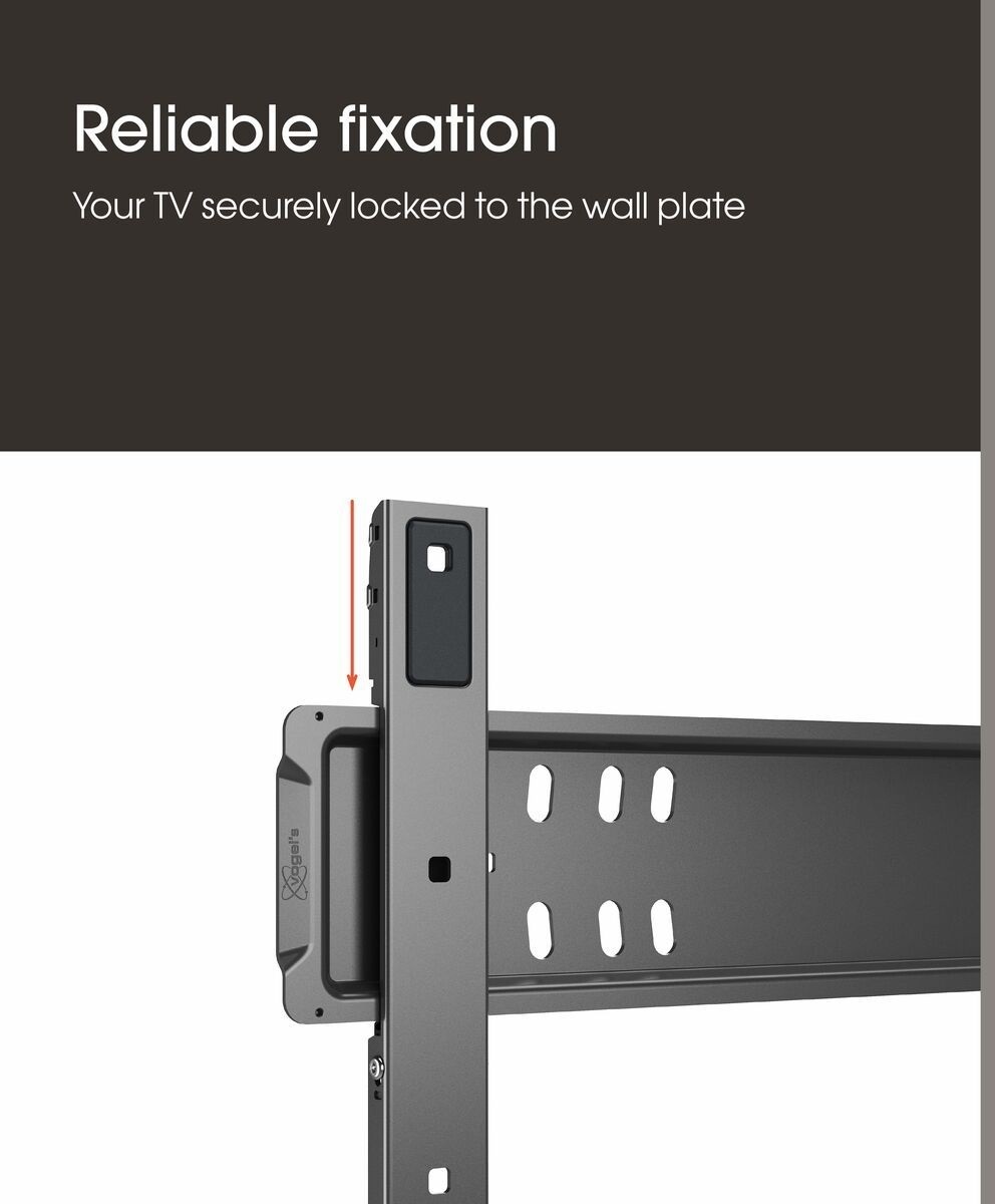 Інноваційна система GuidanceSystem допомагає точно визначити положення телевізора під час встановлення. Достатньо прикріпити пристрій до настінної пластини, після чого механізм фіксації одним натисканням надійно зафіксує його без потреби додаткових регулювань. Бічний замок запобігає випадковим зміщенням телевізора, забезпечуючи стабільність навіть у разі легкого дотику чи вібрації.