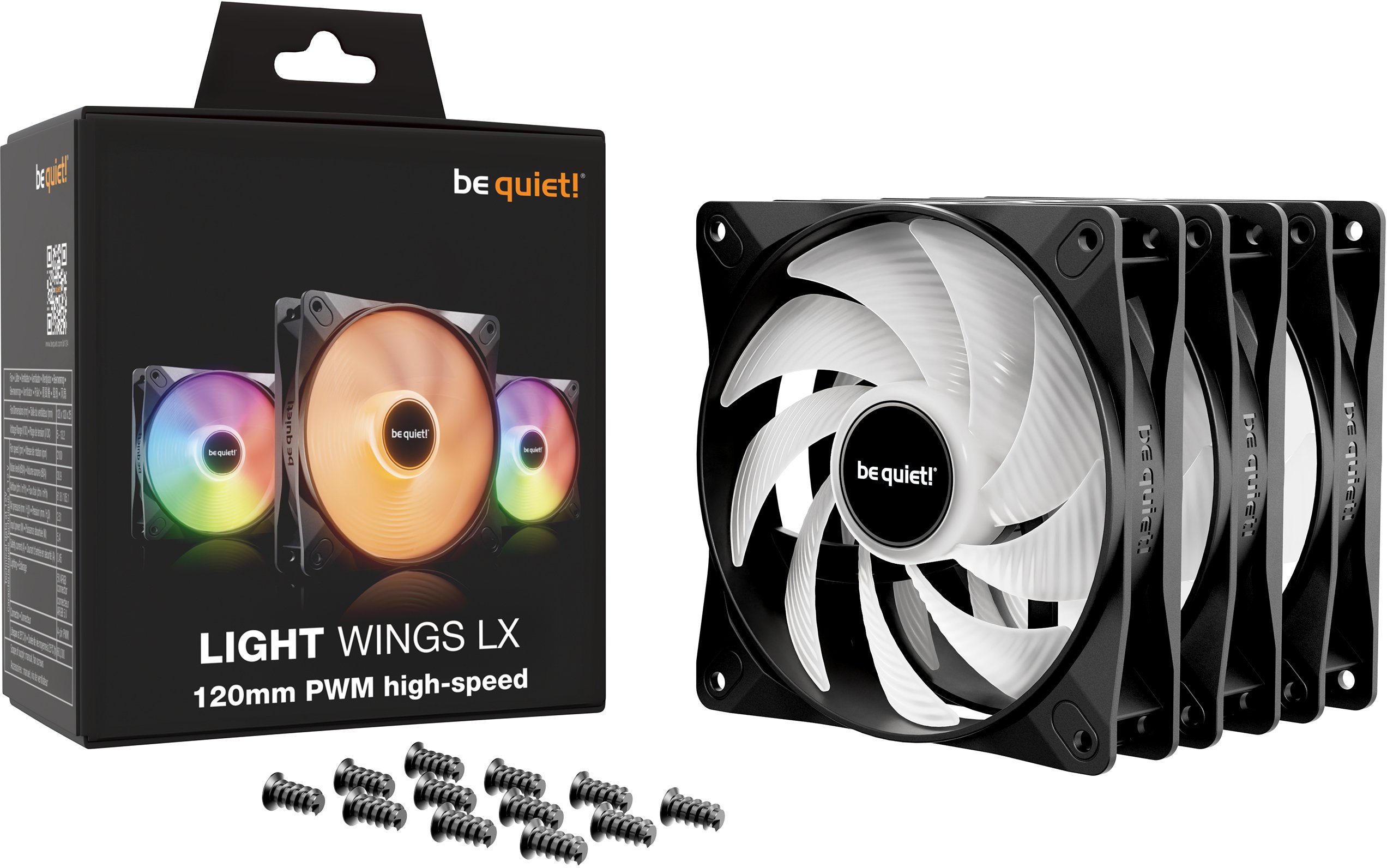 be quiet! Light Wings LX 120mm PWM High-Speed — це преміальний ARGB вентилятор 120 мм із підвищеною продуктивністю, вражаючим підсвічуванням та інноваційною технологією зворотного зв'язку, ідеальний вибір для тих, хто шукає найкращі 120-мм ARGB вентилятори для радіаторів СРО, щільних кулерів CPU та корпусів ПК із вимогливим охолодженням. Версія High-Speed відрізняється від стандартної PWM значно вищими обертами, більшим тиском повітря та технологією стабілізації швидкості — при збереженні того самого ефектного підсвічування через матові лопаті.