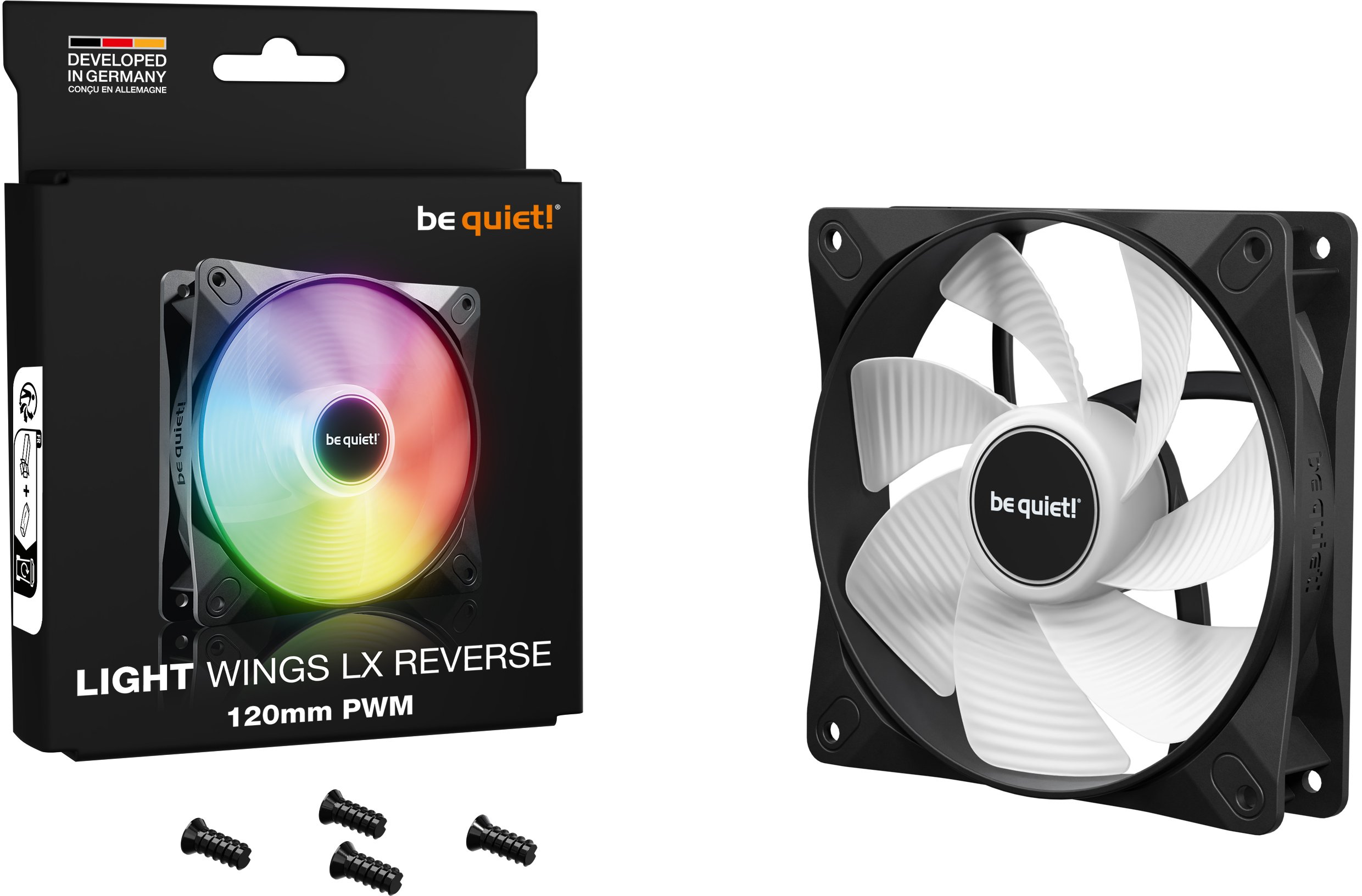 be quiet! Light Wings LX 120mm PWM Reverse — це 120-мм корпусний вентилятор з реверсивними лопатями та адресним ARGB-підсвічуванням, створений насамперед для тих збірок, де зовнішній вигляд має не менше значення, ніж охолодження. Чорне виконання, матові напівпрозорі лопаті та підсвічування зсередини крильчатки перетворюють цей вентилятор на самодостатній візуальний акцент будь-якої відкритої системи.