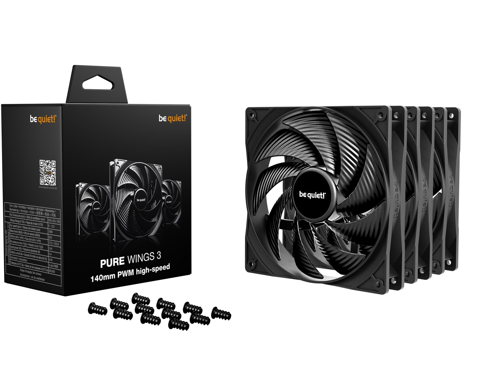 be quiet! Pure Wings 3 140mm PWM High-Speed — це потужний продуктивний вентилятор 140 мм у комплекті з трьох штук, який є ідеальним вибором для тих, хто шукає найкращі 140-мм вентилятори для радіаторів СРО, щільних повітряних кулерів CPU та корпусів ПК із вимогливими конфігураціями охолодження без підсвічування. Версія High-Speed відрізняється від стандартної PWM підвищеною максимальною швидкістю та унікальною технологією зворотного зв'язку для стабілізації обертів — поєднання, яке робить її топовим рішенням серед продуктивних 140-мм вентиляторів.