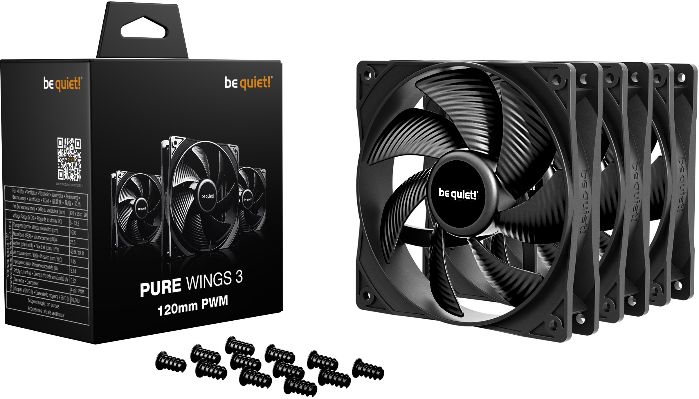 be quiet! Pure Wings 3 120mm PWM — це тихий та надійний корпусний вентилятор 120 мм у комплекті з трьох штук, який є оптимальним вибором для тих, хто шукає бюджетні тихі вентилятори для корпусу ПК або радіаторів системи охолодження без підсвічування. На відміну від версії High-Speed, стандартна PWM-версія орієнтована на максимально тиху роботу з балансом між продуктивністю та рівнем шуму — ідеальне рішення для збірок, де тиша важливіша за граничну продуктивність.