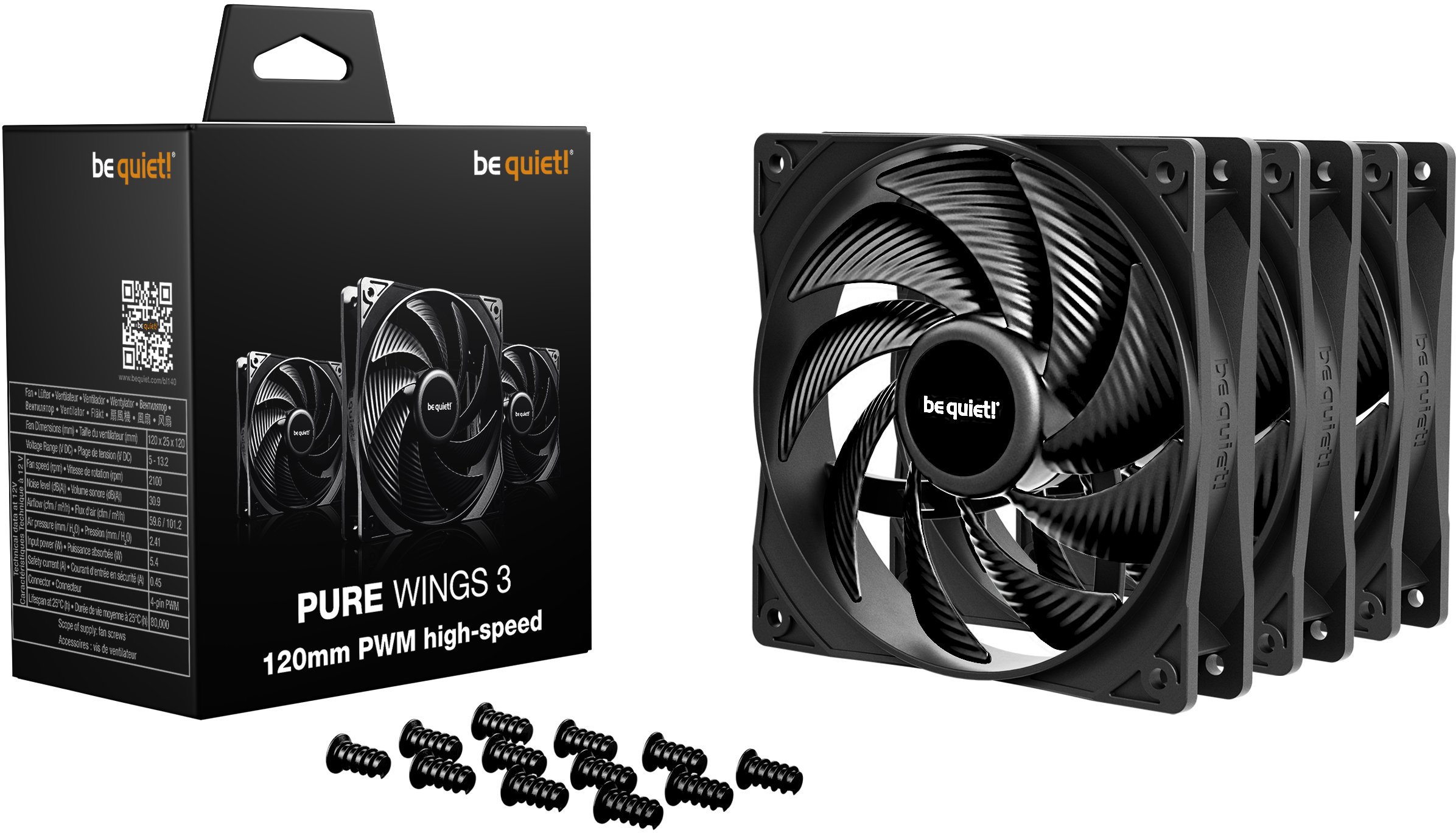 be quiet! Pure Wings 3 120mm PWM High-Speed — це продуктивний корпусний вентилятор 120 мм у комплекті з трьох штук, який є ідеальним вибором для тих, хто шукає тихі та ефективні вентилятори для радіаторів СРО, корпусів ПК і повітряних кулерів CPU без підсвічування. Версія High-Speed розрахована на максимальну продуктивність охолодження в ситуаціях, де стандартного тиску повітря не вистачає — наприклад, при роботі з щільними радіаторами або навантаженими системами охолодження.