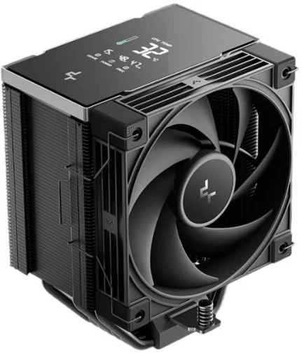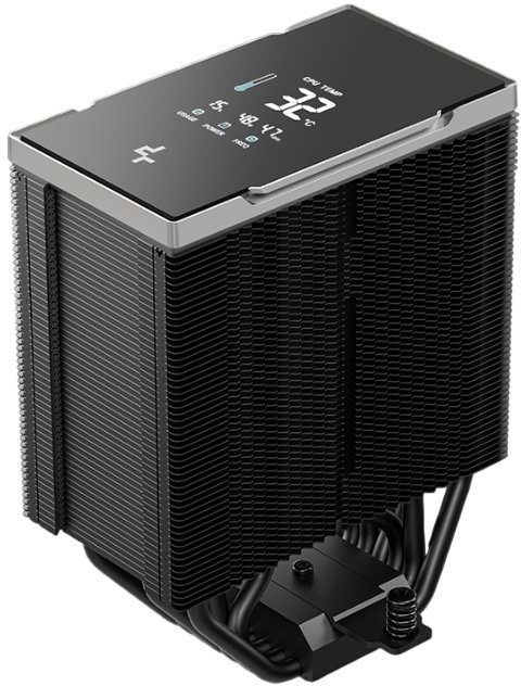 Головною особливістю є чотирисегментний цифровий дисплей, який у реальному часі показує температуру процесора, навантаження, споживання енергії та частоту. Дисплей керується через програмне забезпечення DeepCool і доповнений системою візуального сповіщення про температуру. Інтегрований AI-алгоритм DeepCreative автоматично відстежує навантаження CPU та підбирає оптимальну криву обертів вентилятора, дозволяючи досягти балансу між охолодженням і тишею без ручного налаштування в BIOS.