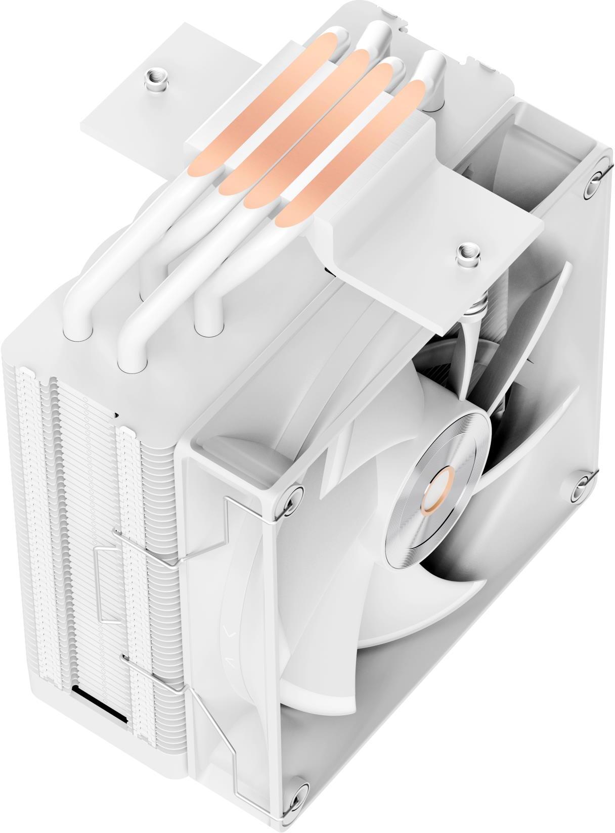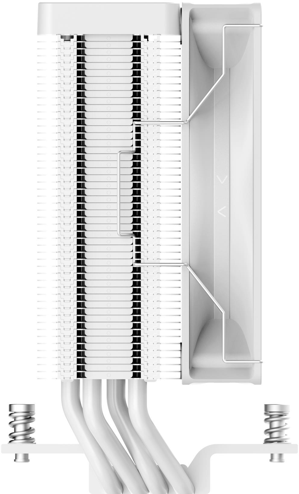 Дизайн кулера натхненний мінімалізмом з акцентом на круглі елементи: заокруглена верхня кришка з дзеркальним візерунком із крапок і гармонійний масив ребер. Така конструкція не лише виглядає стильно, але й знижує опір повітрю, зменшує шум і покращує теплообмін. Складені краї та технологія clipped FIN додають міцності й текстури.