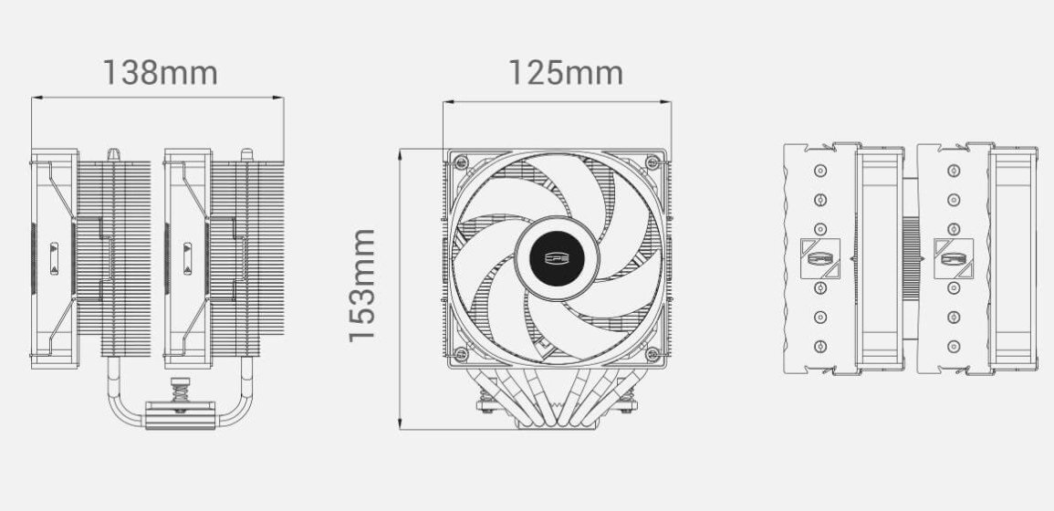 Кулер має компактну висоту близько 153–157 мм, що дозволяє встановлювати його в більшість Mid-Tower корпусів, водночас залишаючи достатньо простору для високих модулів оперативної пам’яті завдяки спеціальним вирізам у радіаторі. Міцна мідна база і добре оброблені поверхні кулера забезпечують надійний контакт із процесором, а стійке кріплення знижує ризик деформацій при монтажі.