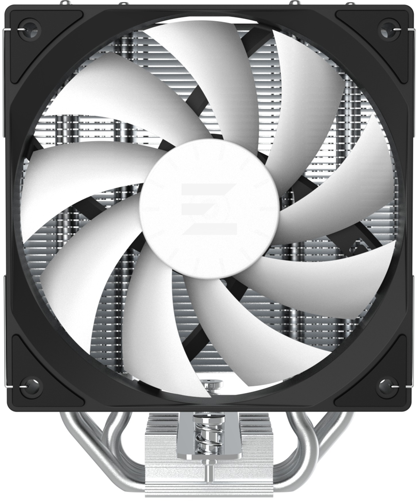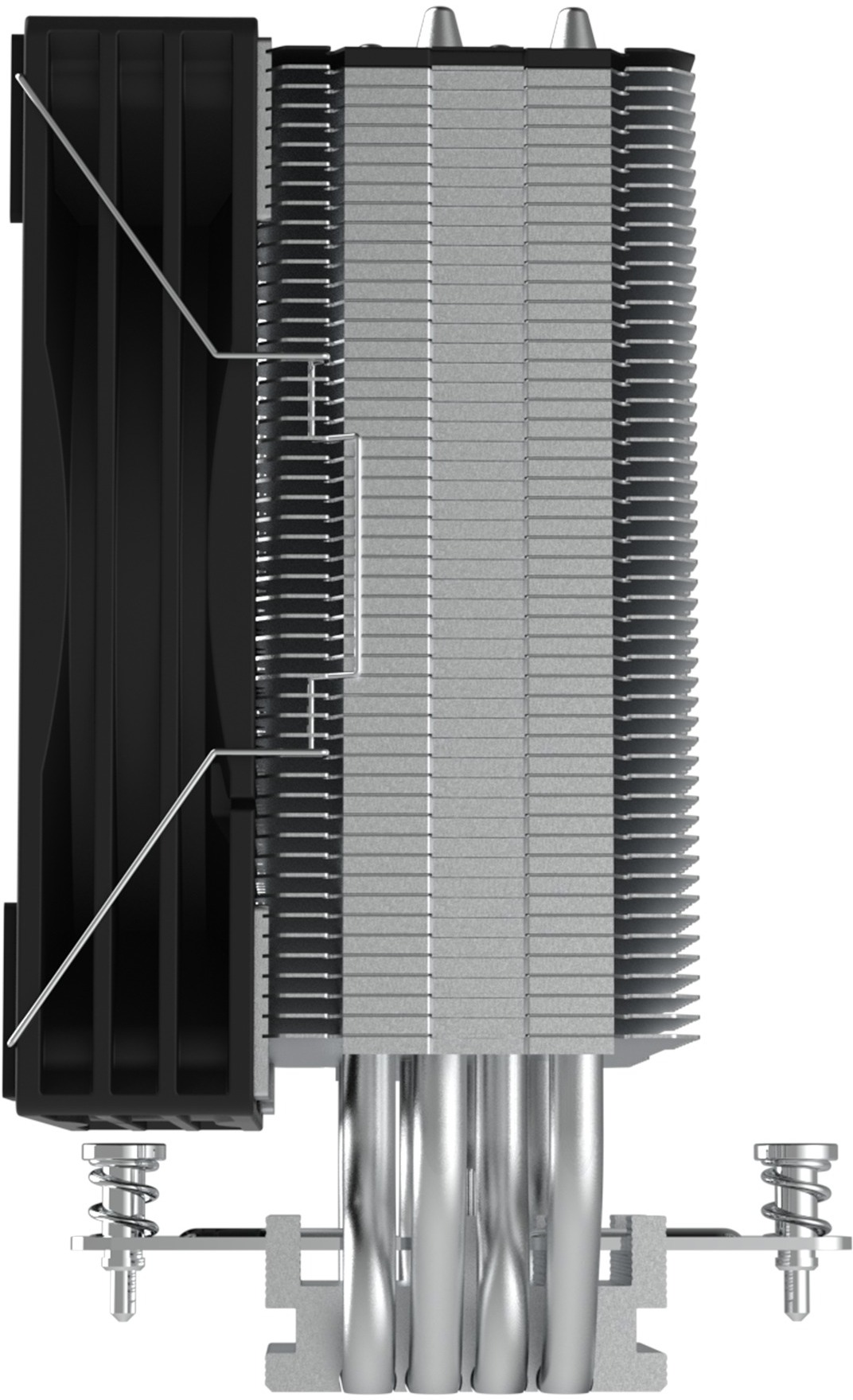 Конструкція включає алюмінієвий радіатор із чорним анодованим покриттям та хромованими тепловими трубками, що підвищує теплопровідність і стійкість до корозії, а також додає естетичного вигляду. Вентилятор 120 мм із PWM-керуванням працює в діапазоні 800–1500 об/хв, створюючи повітряний потік до 47.12 CFM при максимальному тиску 1.06 мм H₂O, з рівнем шуму до 29.5 дБ, що забезпечує тиху роботу навіть під навантаженням.