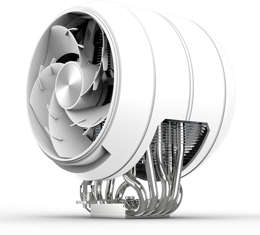 Ця модель у білому кольорі базується на баштовій конструкції з 5 мідними тепловими трубками прямого контакту (Direct Touch), що ефективно відводять тепло від CPU до алюмінієвого радіатора з оптимізованими ребрами, перетворюючи потенційний перегрів на стабільний тепловий баланс для процесорів з TDP до 220 Вт, роблячи її придатною для середньопродуктивних збірок на базі LGA 1851/1700/1200/115X (Intel) та AM5/AM4 (AMD). Сумісність з останніми платформами, включаючи Intel Core Ultra (Arrow Lake) та AMD Ryzen 7000/9000, забезпечує майбутню готовність, з універсальним кріпленням для швидкої установки без інструментів.