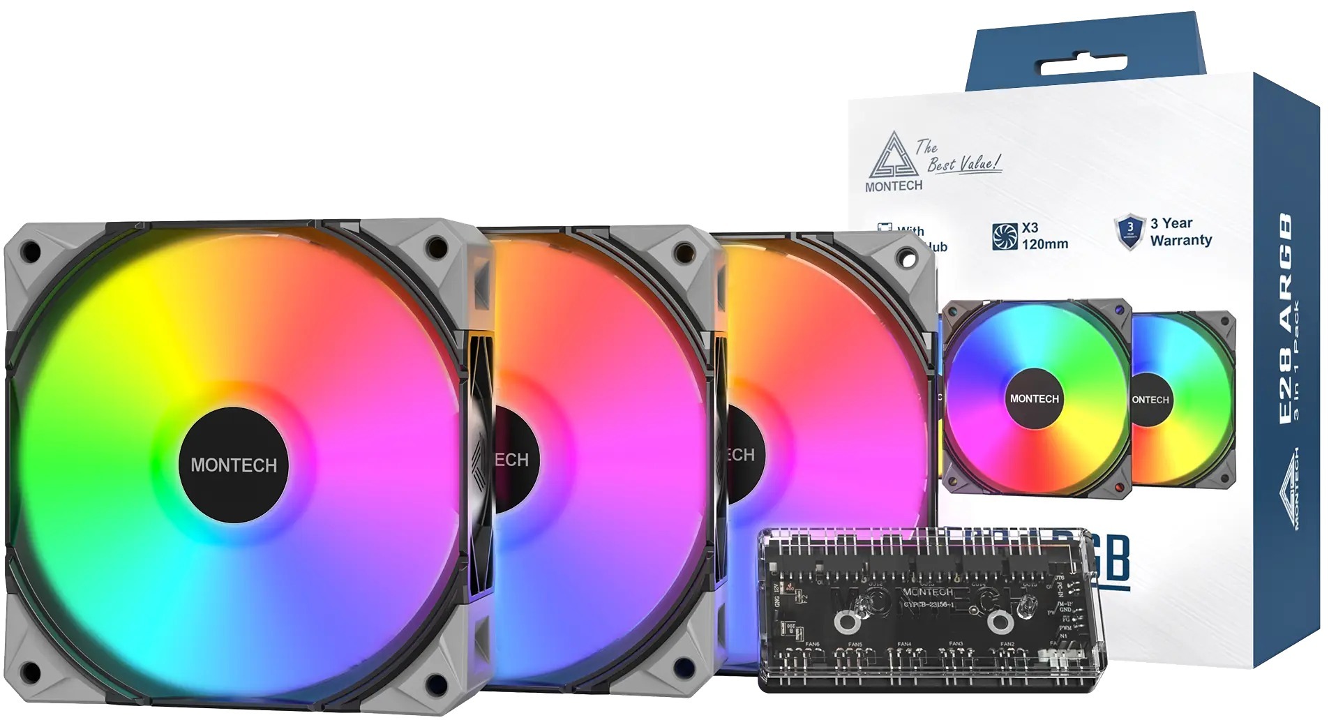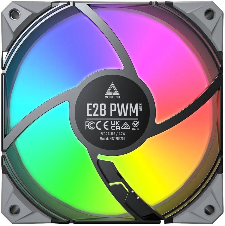Montech E28 ARGB — це потужний 120-мм вентилятор охолодження, який ідеально підходить для вимогливих збірок ПК, де потрібен максимальний потік повітря та тиша. З товщиною і лопатями, оптимізованими для статичного тиску, він генерує до 85,09 CFM повітряного потоку та 3,35 мм H₂O тиску, легко проникаючи в щільні радіатори та забезпечуючи ефективне охолодження гарячих компонентів.