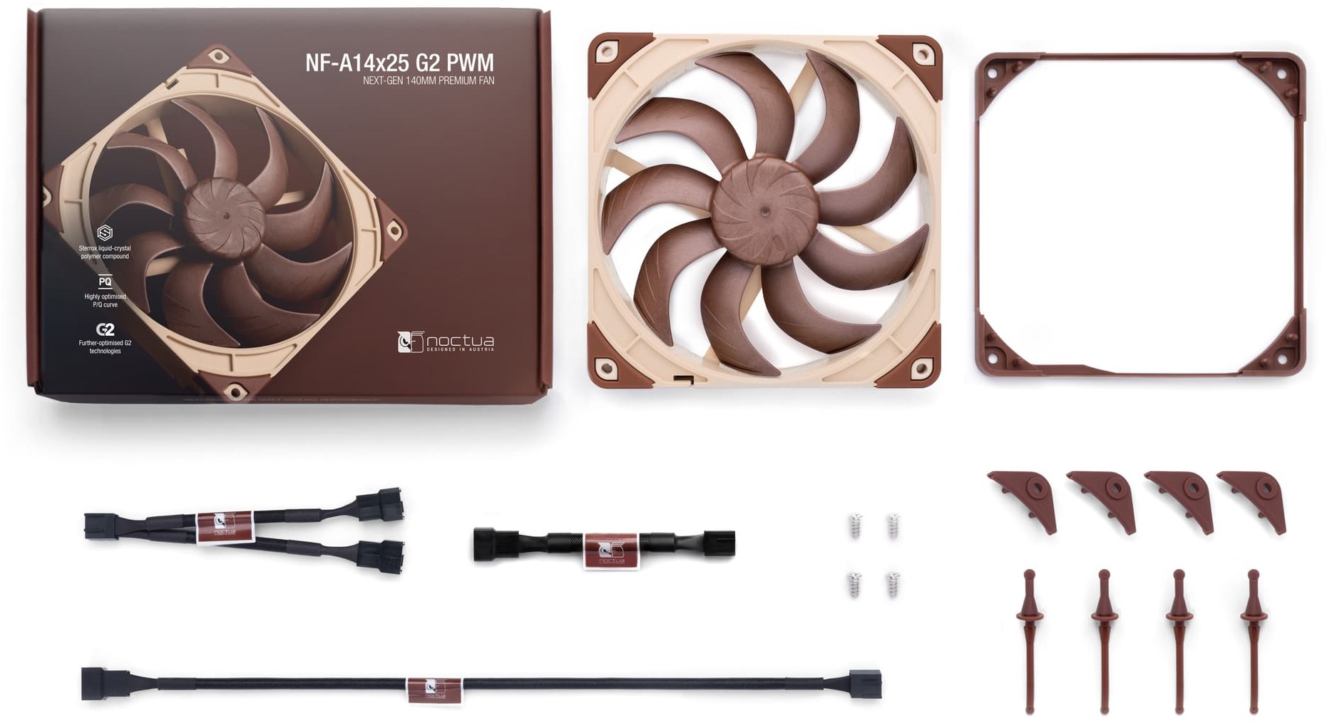 Завдяки високооптимізованій кривій P/Q вентилятор демонструє видатні результати як у завданнях, що потребують високого повітряного потоку (корпусне охолодження), так і в конфігураціях із високим статичним тиском (радіатори та щільні теплообмінники). Для кращої адаптації до конкретних умов NF-A14x25 G2 постачається з попередньо встановленою антивібраційною прокладкою NA-AVG2-LR, яка створює щільніше ущільнення при монтажі на радіатори, а фірмова рама AAO (Advanced Acoustic Optimisation) сумісна з додатковою прокладкою впускного отвору NA-IS1-14, що допомагає покращити акустику та повітряний потік у складних корпусних конфігураціях.