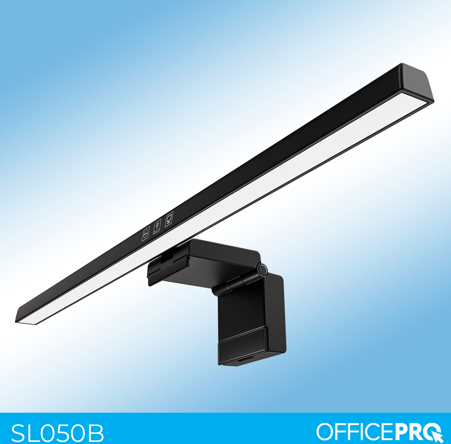 OfficePro SL050B — це LED-лампа для монітора у чорному виконанні, розроблений для тих, хто проводить тривалий час за комп'ютером і хоче організувати якісне робоче освітлення без зайвих ускладнень. На відміну від звичайної настільної лампи, скрінбар кріпиться безпосередньо на верхній край монітора за допомогою прищіпки з антиковзними накладками — не займає місця на столі та не ковзає по корпусу, захищаючи його від подряпин. Довжина лампи складає 500 мм, що дозволяє рівномірно освітлювати весь простір перед монітором.