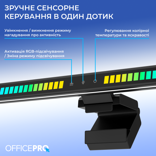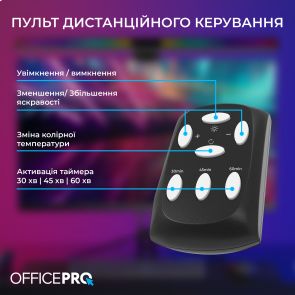 Керування реалізовано через сенсорний пульт, що дозволяє одним дотиком вмикати або вимикати лампу, змінювати яскравість і колірну температуру, а також активувати та налаштовувати RGB-підсвічування. Окрема кнопка відповідає за режим нагадування про активність, допомагаючи підтримувати здоровий баланс під час тривалого сидіння за комп’ютером.