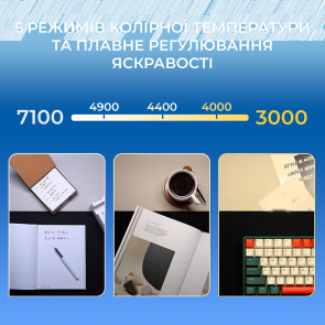 Модель оснащена ефективними SMD-світлодіодами зі світловим потоком 700 Лм та індексом передачі кольору CRI понад 80, що гарантує природне відтворення кольорів і рівномірне освітлення. Лампа підтримує 5 режимів колірної температури в широкому діапазоні від 3000K до 7100K із плавним регулюванням яскравості, що дозволяє легко адаптувати освітлення під будь-які умови — від теплого затишного до холодного робочого світла.
