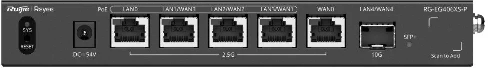 RG-EG406XS-P від Ruijie Reyee — це сучасний компактний маршрутизатор, спеціально розроблений для забезпечення високошвидкісного доступу до інтернету в приватних будинках, невеликих та середніх офісах, ресторанах чи торгових точках. Завдяки п’яти мультигігабітним портам (з яких чотири підтримують PoE/PoE+ з бюджетом 110 Вт) та додатковому 10-гігабітному SFP+ порту пристрій ідеально підходить для сценаріїв, де потрібна повноцінна підтримка швидкостей 2,5 Гбіт/с по всій мережі. Чотириядерний процесор з частотою 2,0 ГГц, 1 ГБ оперативної пам’яті та пропускна здатність до 2500 Мбіт/с дозволяють комфортно обслуговувати до 400 одночасних клієнтів без помітних затримок.