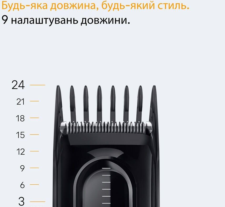 У комплекті ви отримаєте машинку для стрижки, універсальний гребінець (3–24 мм) та щіточку для очищення — все необхідне для догляду за волоссям на професійному рівні.