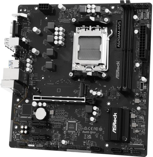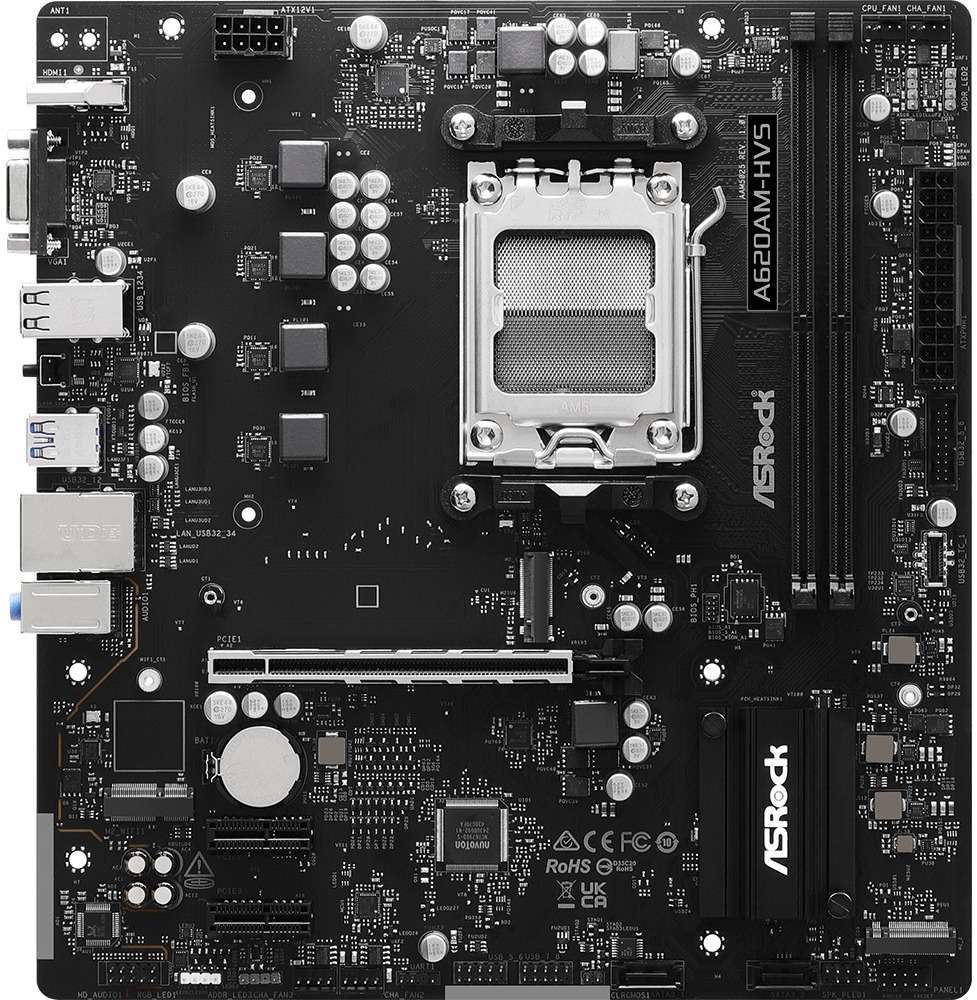 ASRock A620AM-HVS — це компактна материнська плата форм-фактора Micro ATX на чипсеті AMD A620, створена для щоденних завдань з надійною продуктивністю. Вона підтримує процесори AMD Ryzen 9000, 8000 та 7000 серій на сокеті AM5, забезпечуючи стабільну роботу для дому чи офісу.