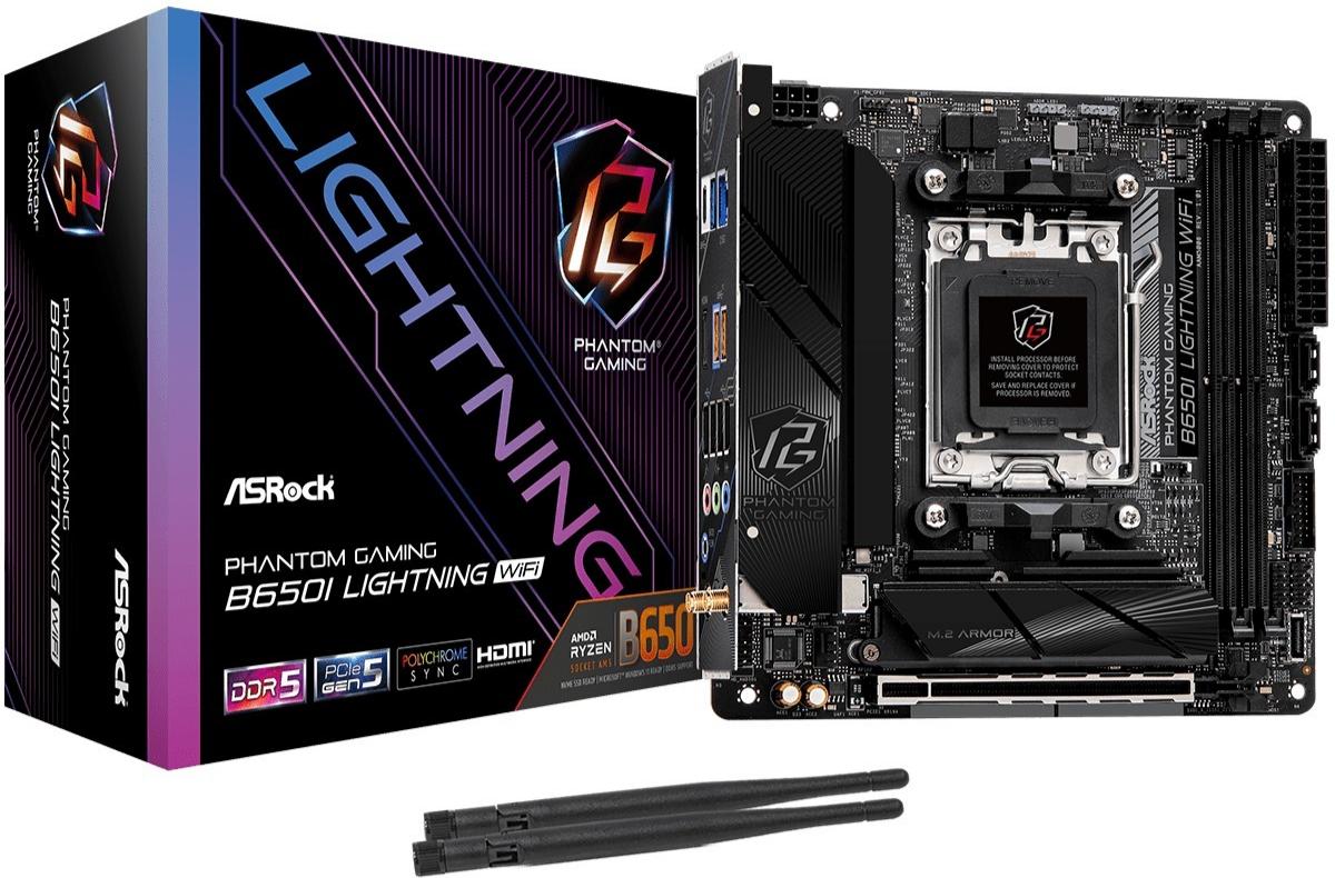 ASRock B650I Lightning WiFi — це компактна материнська плата форм-фактора Mini-ITX на чипсеті AMD B650, створена для потужних ігрових чи робочих систем у невеликих корпусах. Вона підтримує процесори AMD Ryzen 9000, 8000 та 7000 серій на сокеті AM5, забезпечуючи стабільну роботу з сучасними компонентами.