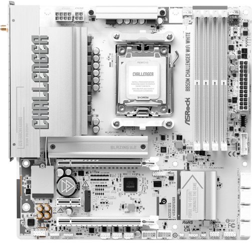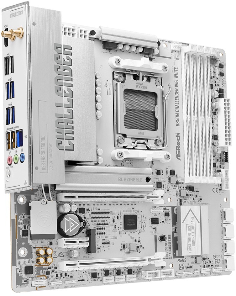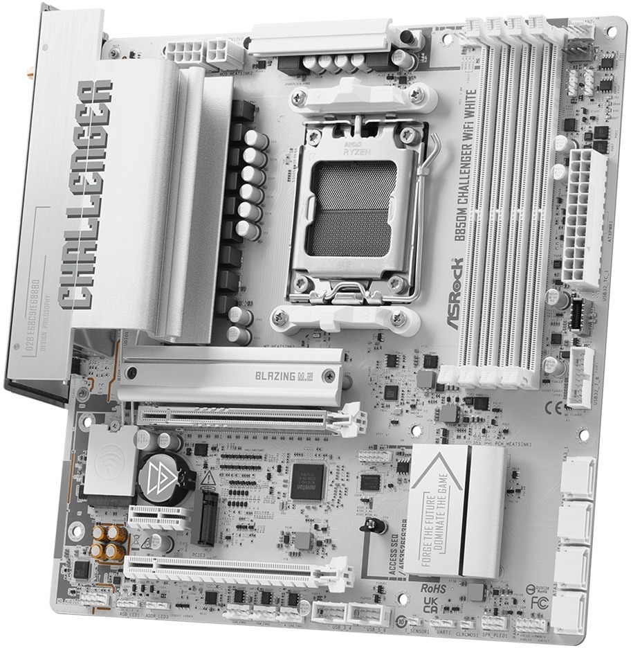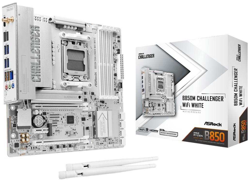 ASRock B850M Challenger WIFI WHITE — це компактна материнська плата форм-фактору Micro ATX на чипсеті AMD B850 для процесорів AMD Ryzen серій 9000, 8000 та 7000 у сокеті AM5. Серія Challenger орієнтована на геймерів, пропонуючи ігрові функції та твердий набір характеристик за доступну ціну.