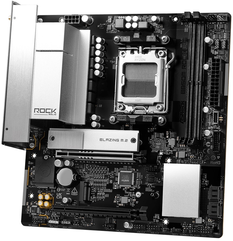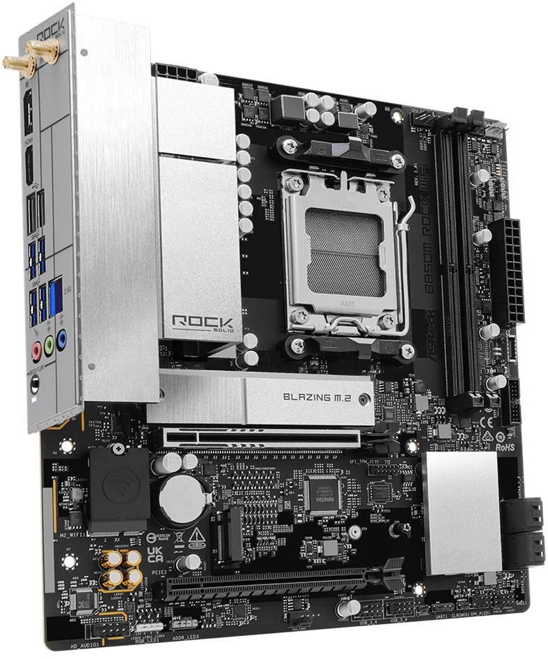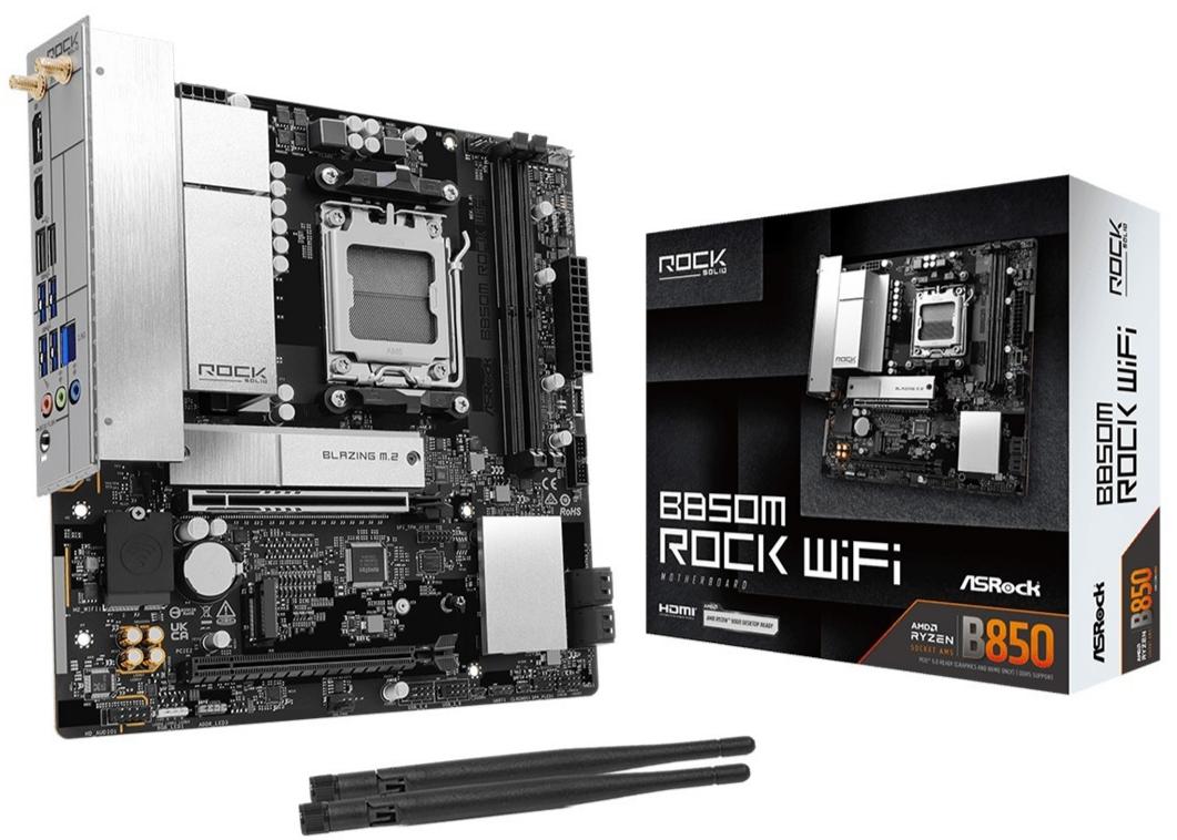 ASRock B850M Rock WiFi — це компактна материнська плата форм-фактору Micro ATX на чипсеті AMD B850, розрахована на процесори AMD Ryzen серій 9000, 8000 та 7000 у сокеті AM5. Серія Rock пропонує надійну продуктивність і сучасний дизайн для щоденної роботи, навчання та ігор.