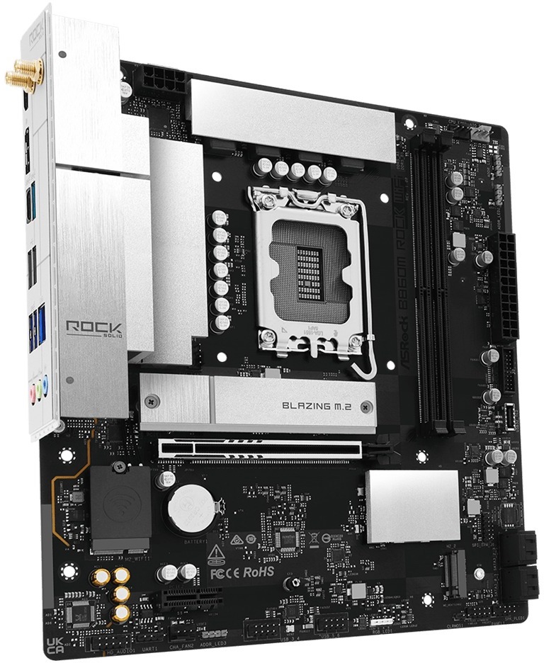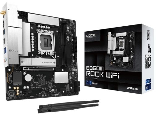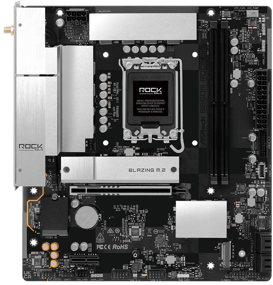 ASRock B860M Rock WiFi — це материнська плата форм-фактору Micro ATX на чипсеті Intel B860, розрахована на процесори Intel Core Ultra серії 2 у сокеті LGA1851. Серія Rock орієнтована на збалансоване співвідношення надійності та функціональності, пропонуючи зрозумілий дизайн і практичний набір можливостей для роботи, навчання та ігор.