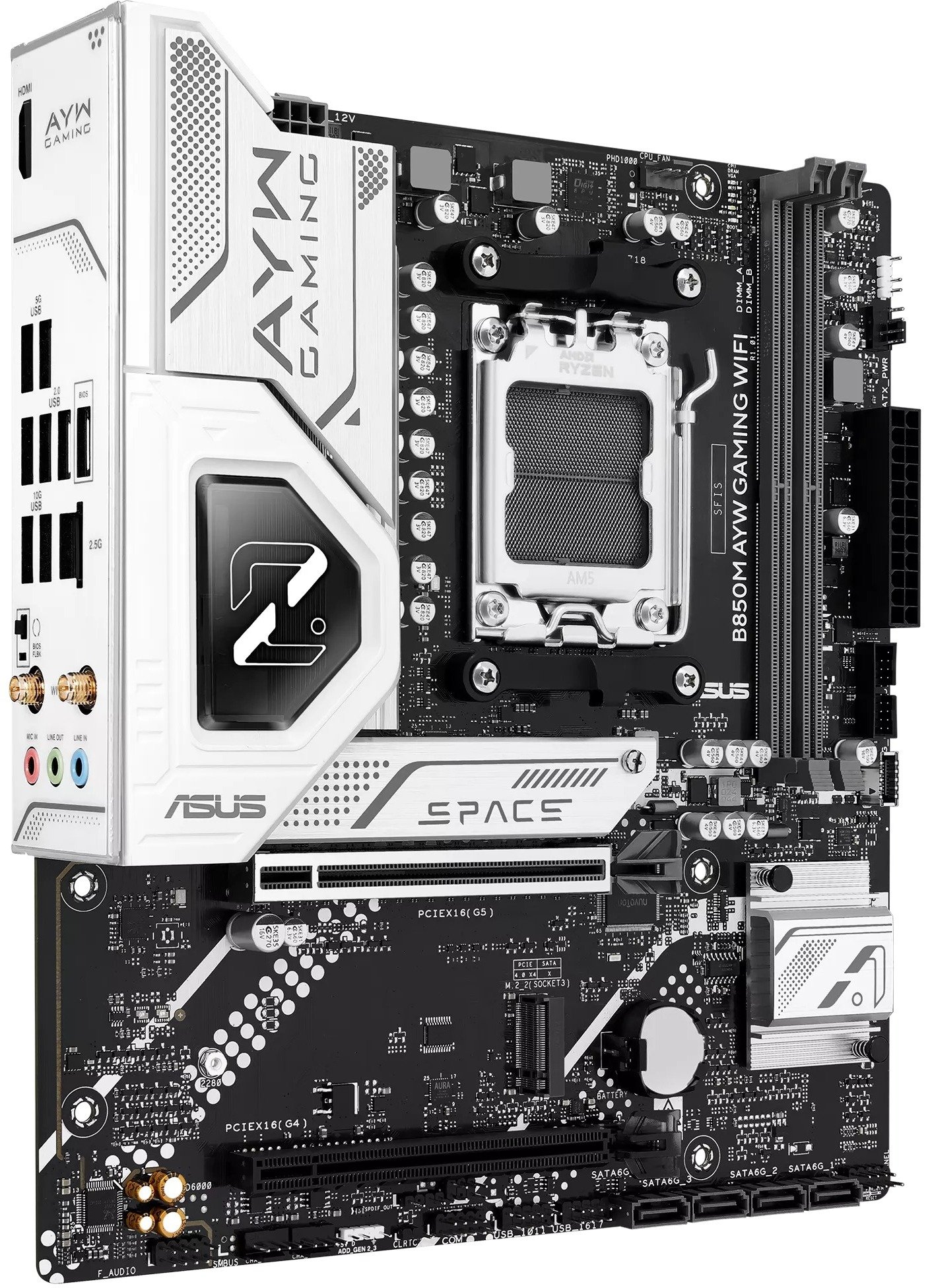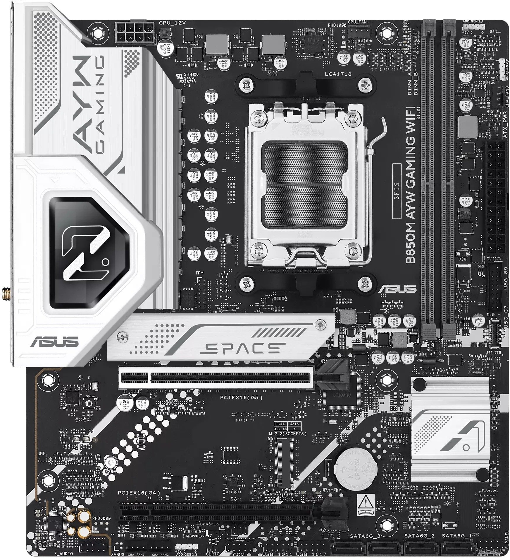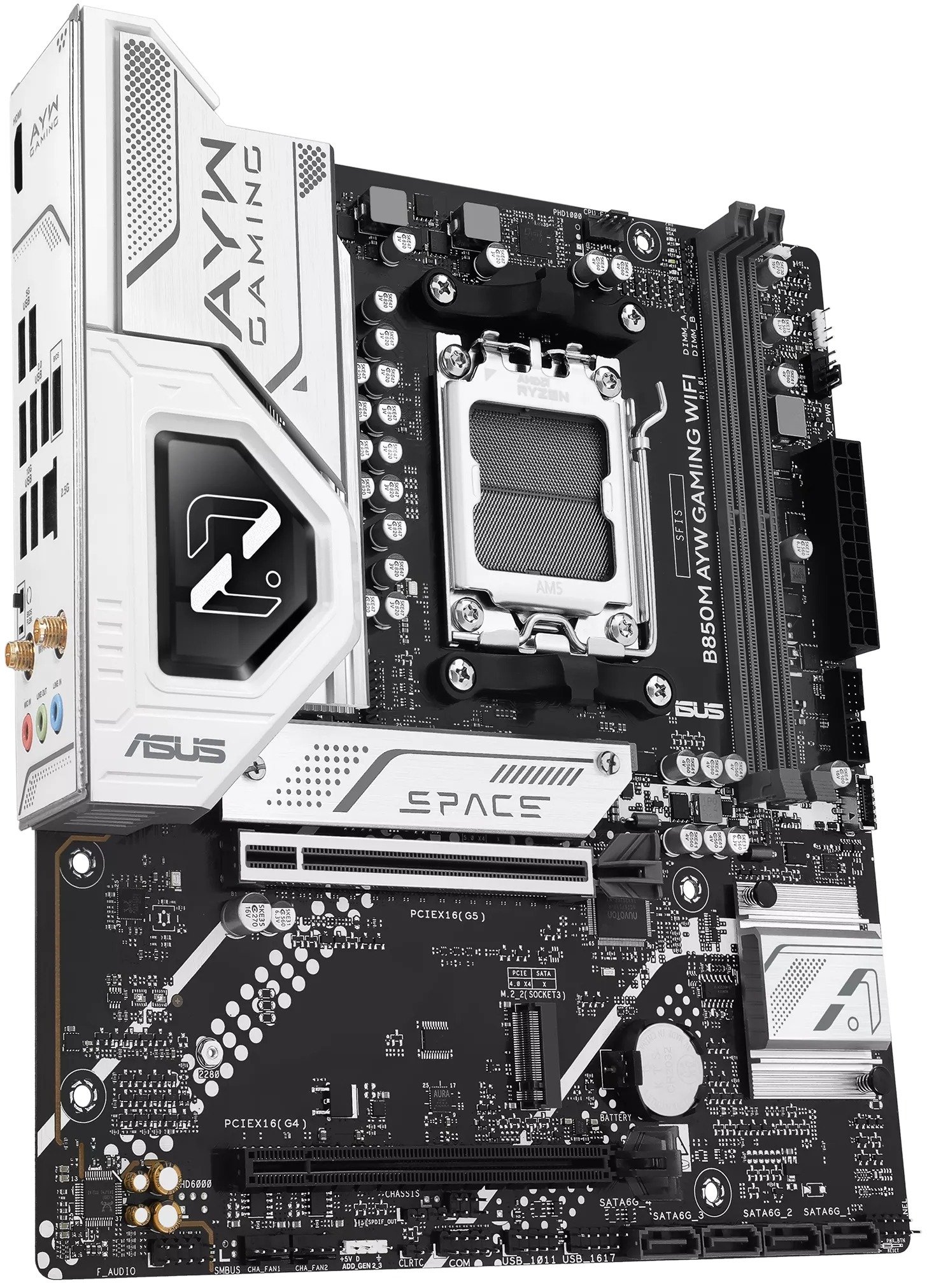 ASUS B850M AYW Gaming WIFI — це материнська плата на базі чипсета AMD B850, призначена для розкриття повного потенціалу процесорів AMD Ryzen 9000, 8000 та 7000 серій. Вона пропонує оптимальну продуктивність завдяки інтуїтивному програмному забезпеченню та функціям прошивки, а також готова до використання в системах з підтримкою штучного інтелекту.