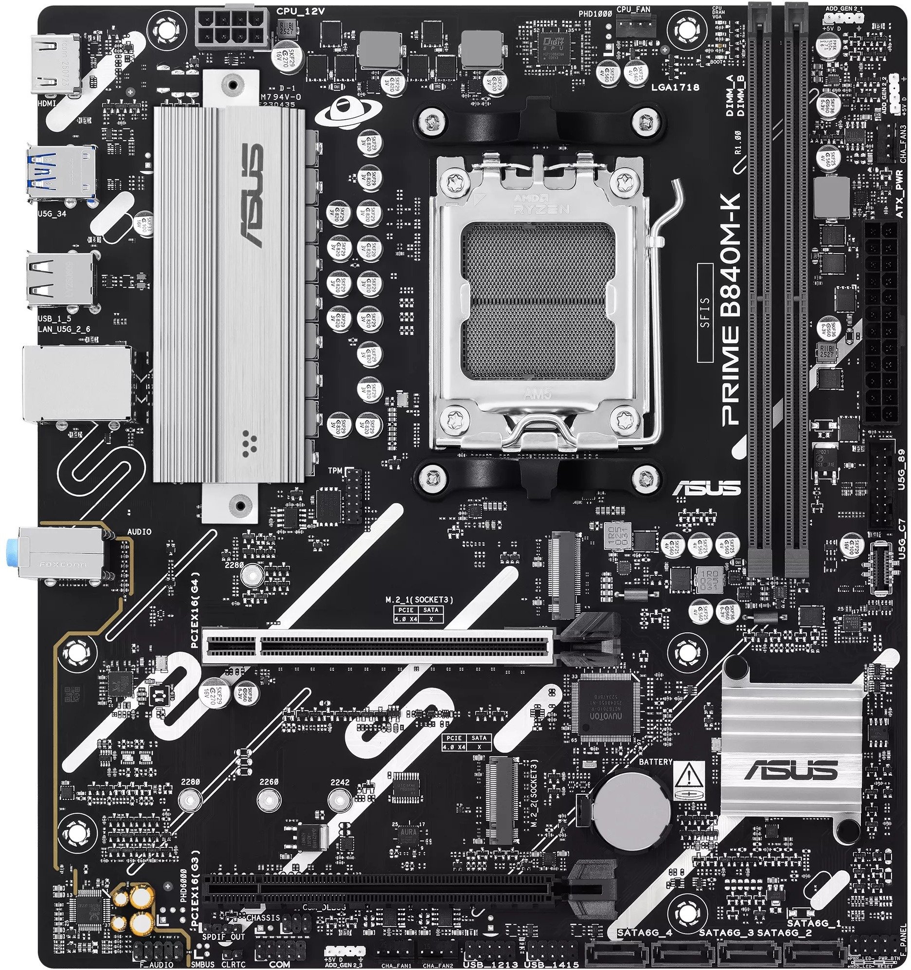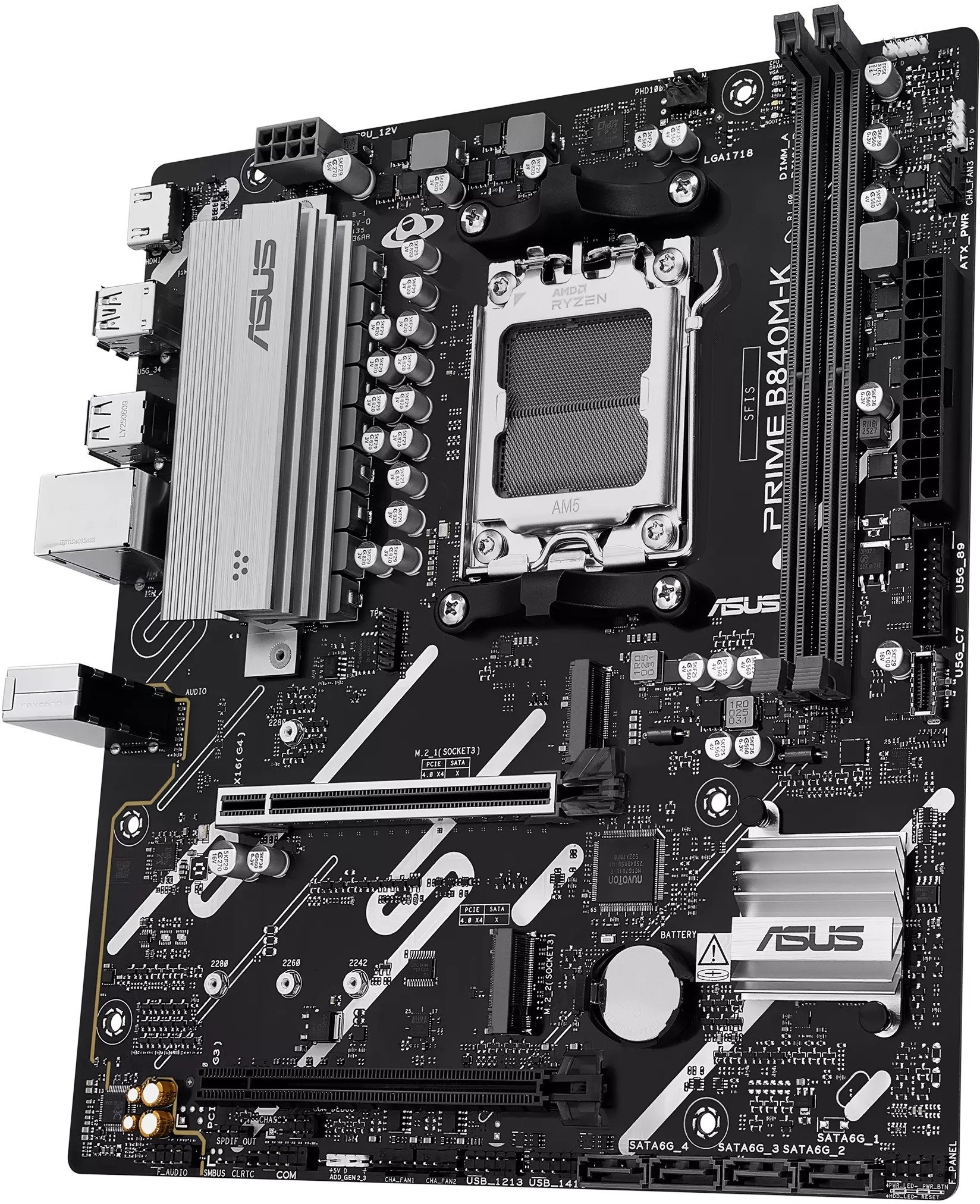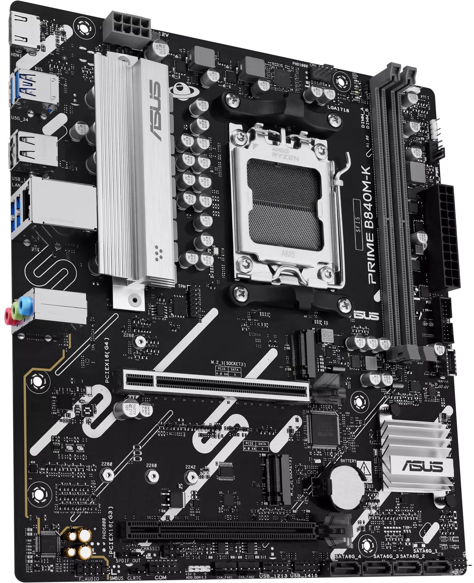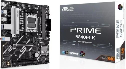 Материнська плата ASUS PRIME B840M-K — це компактне рішення формату micro-ATX на чипсеті AMD B840, призначене для сучасних систем середнього рівня. Вона підтримує процесори AMD Ryzen 9000, 8000 та 7000 серій і пропонує баланс між доступною ціною, стабільністю та сучасними технологіями, включаючи DDR5-пам’ять і швидкісні інтерфейси.