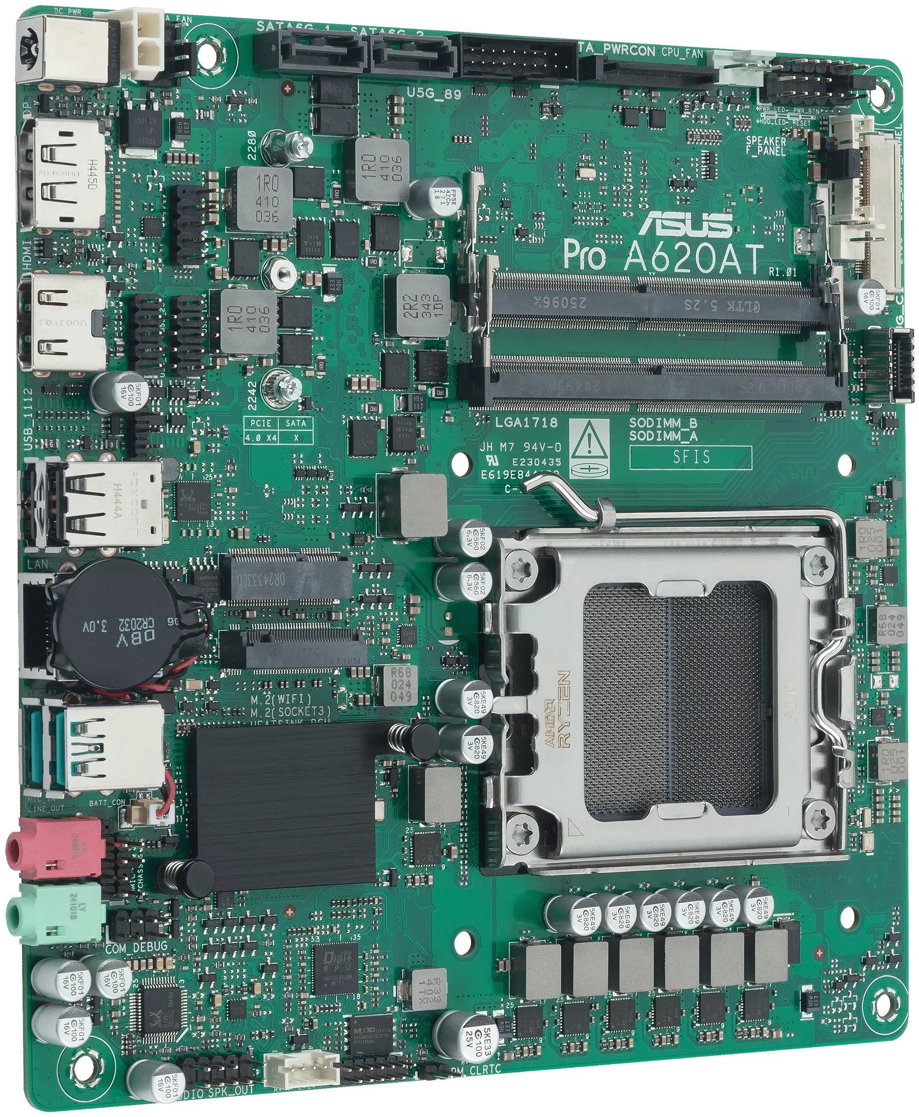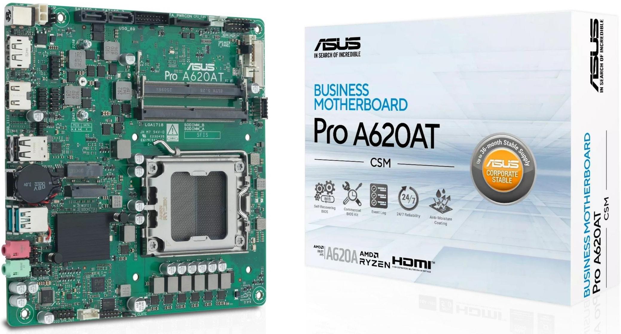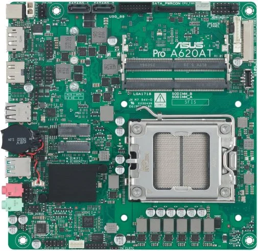 Материнська плата ASUS PRO A620AT-CSM — це компактне рішення у форм-факторі Mini-ITX, розроблене спеціально для бізнес-систем та корпоративного використання. Вона базується на чипсеті AMD A620 та підтримує процесори AMD Ryzen 9000, 8000 та 7000 серій. Плата орієнтована на стабільність, підвищену надійність, розширені можливості керування та довгострокову доступність, що робить її оптимальним вибором для офісних ПК, промислових систем, цифрових вивісок.