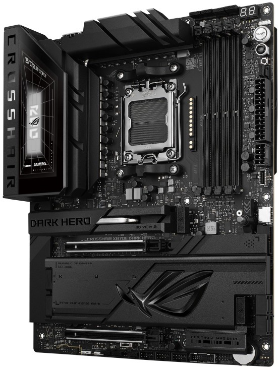 Материнська плата ASUS ROG CROSSHAIR X870E DARK HERO — це преміальне рішення у форм-факторі ATX на чипсеті AMD X870E для високопродуктивних ігрових систем. Вона підтримує процесори AMD Ryzen 9000, 8000 та 7000 серій і оснащена потужною схемою живлення 20+2+2 фаз для стабільної роботи та розгону. Стильний чорний дизайн з інтегрованим охолодженням та передовими технологіями робить її ідеальним вибором для ентузіастів.