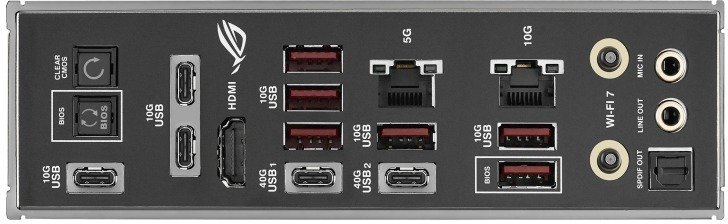 Підключення на найвищому рівні: задня панель з USB4, USB 10 Гбіт/с, HDMI, 5G та 10G Ethernet, Wi-Fi 7 та SupremeFX ALC4082 з Quad DAC ESS ES9219 для 7.1-аудіо з SNR 120 дБ. Фронтальні інтерфейси включають USB 20 Гбіт/с Type-C з QC4+. AI Networking II оптимізує мережу, а AI Cooling II — термоконтроль.
