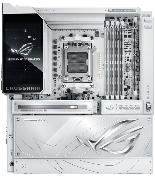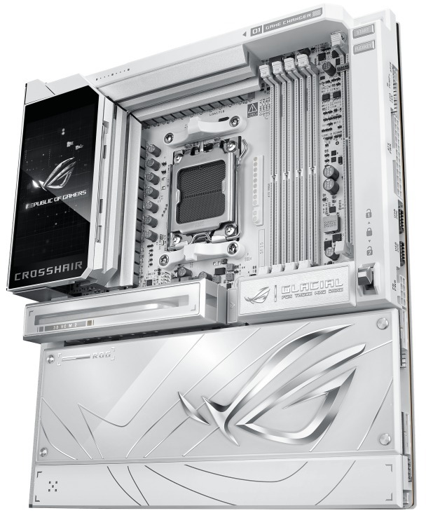 Материнська плата ASUS ROG Crosshair X870E Glacial — це флагманське рішення формату ATX на чипсеті AMD X870E. Вона призначена для ентузіастів та оверклокерів, підтримує процесори AMD Ryzen 9000, 8000 та 7000 серій і пропонує екстремальну потужність живлення, розширені можливості зберігання та передові технології ШІ. Плата вирізняється інтегрованим 5-дюймовим повноколірним LCD-екраном, масивним охолодженням та преміальною естетикою для топових геймерських та продуктивних систем.