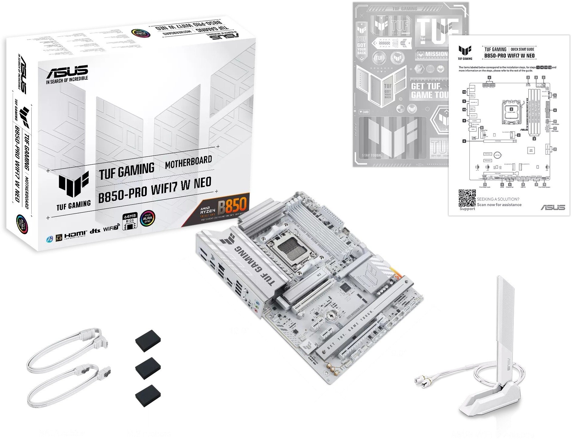 ASUS TUF GAMING B850-PRO WIFI7 W NEO — це материнська плата формату ATX на сокеті AM5, розроблена для процесорів AMD Ryzen серій 7000, 8000 і 9000. Вона поєднує потужну систему живлення, широкі можливості підключення та інструменти на базі штучного інтелекту, що забезпечить стабільну роботу як у звичайних, так і у ресурсомістких завданнях.