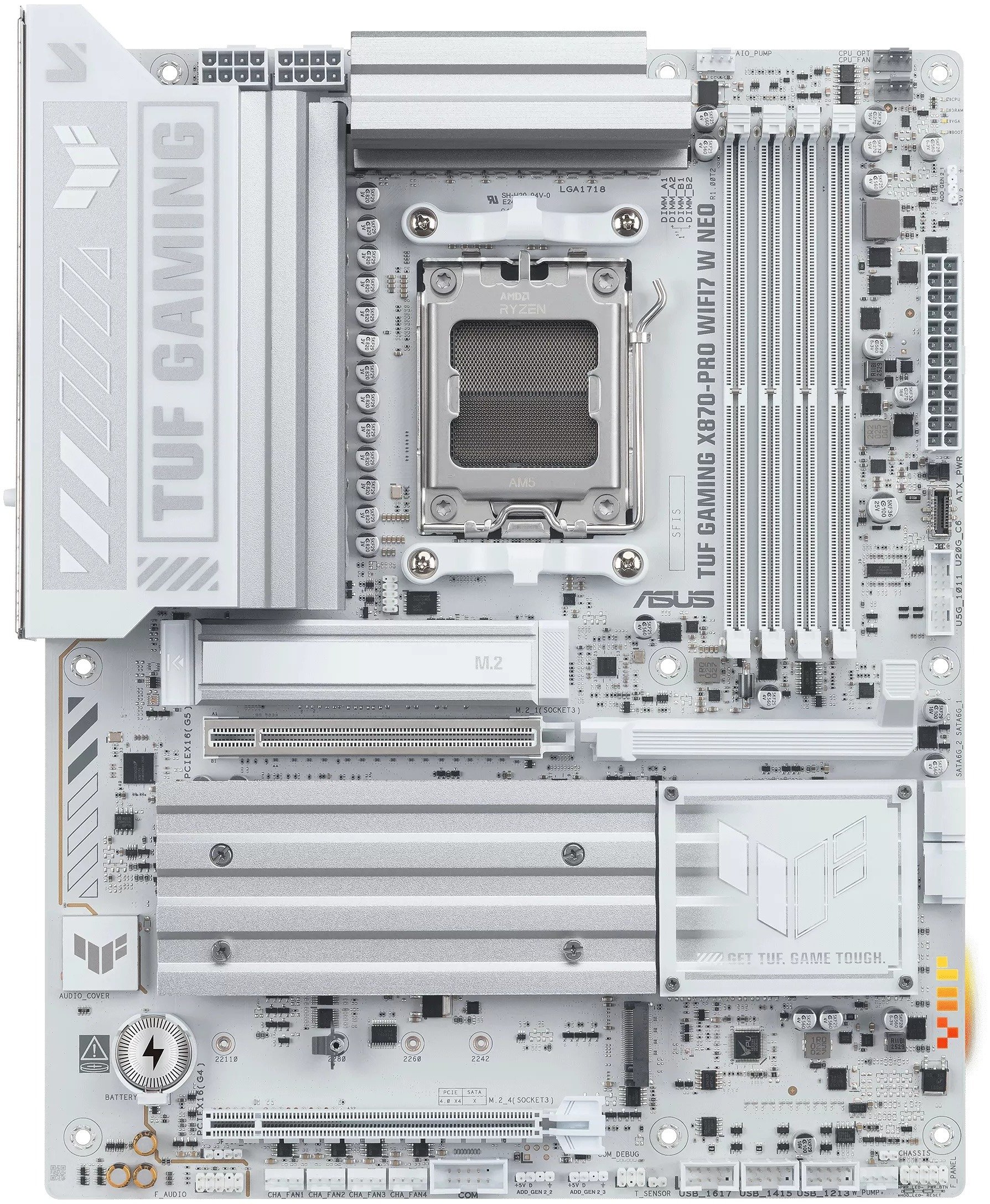 ASUS TUF Gaming X870-PRO WiFi7 W NEO — це материнська плата форм-фактору ATX на чипсеті AMD X870, розроблена для процесорів AMD Ryzen у сокеті AM5. Вона орієнтована на геймерів і ентузіастів, яким потрібна надійна, потужна платформа з підтримкою найсучасніших технологій і широкими можливостями підключення.