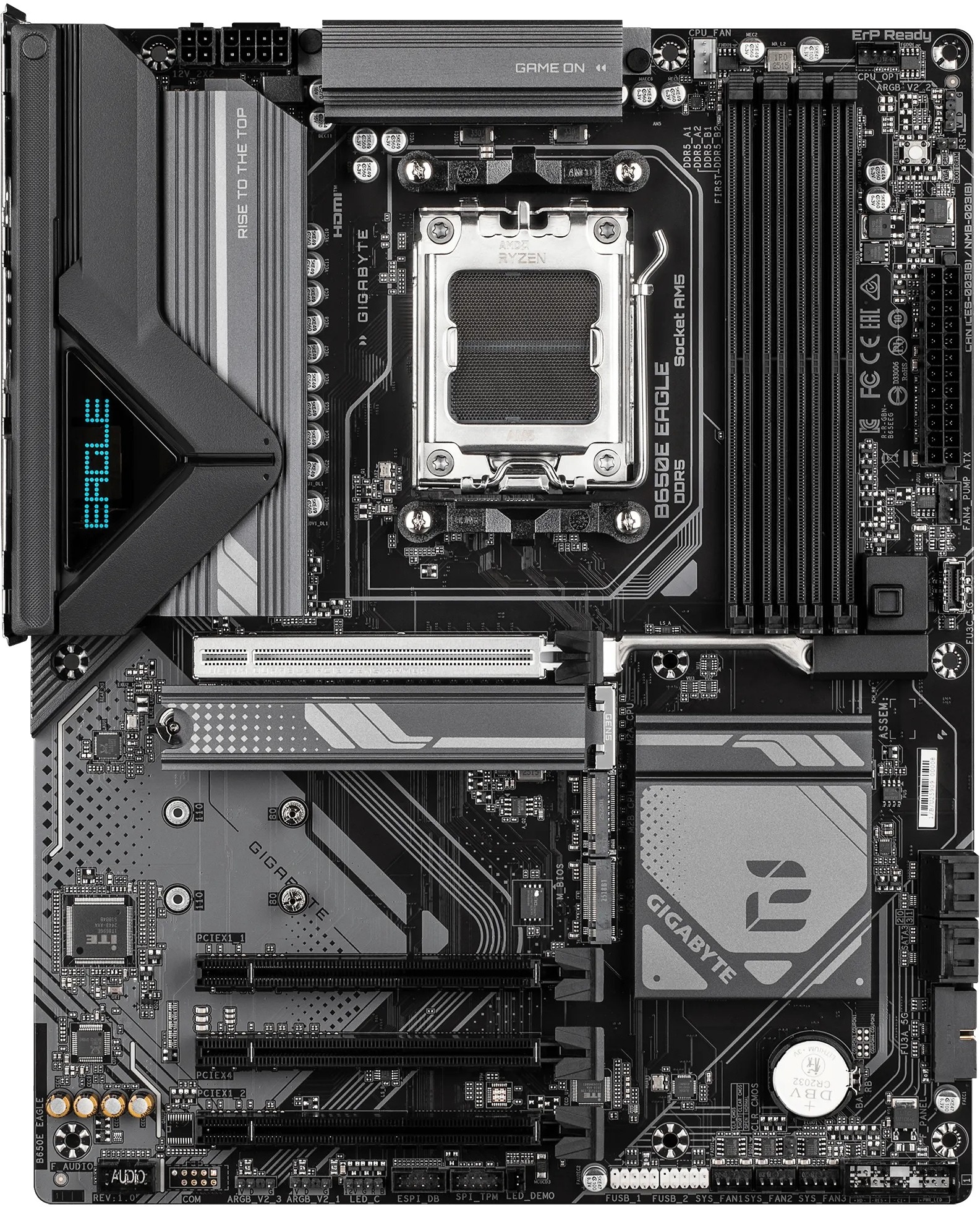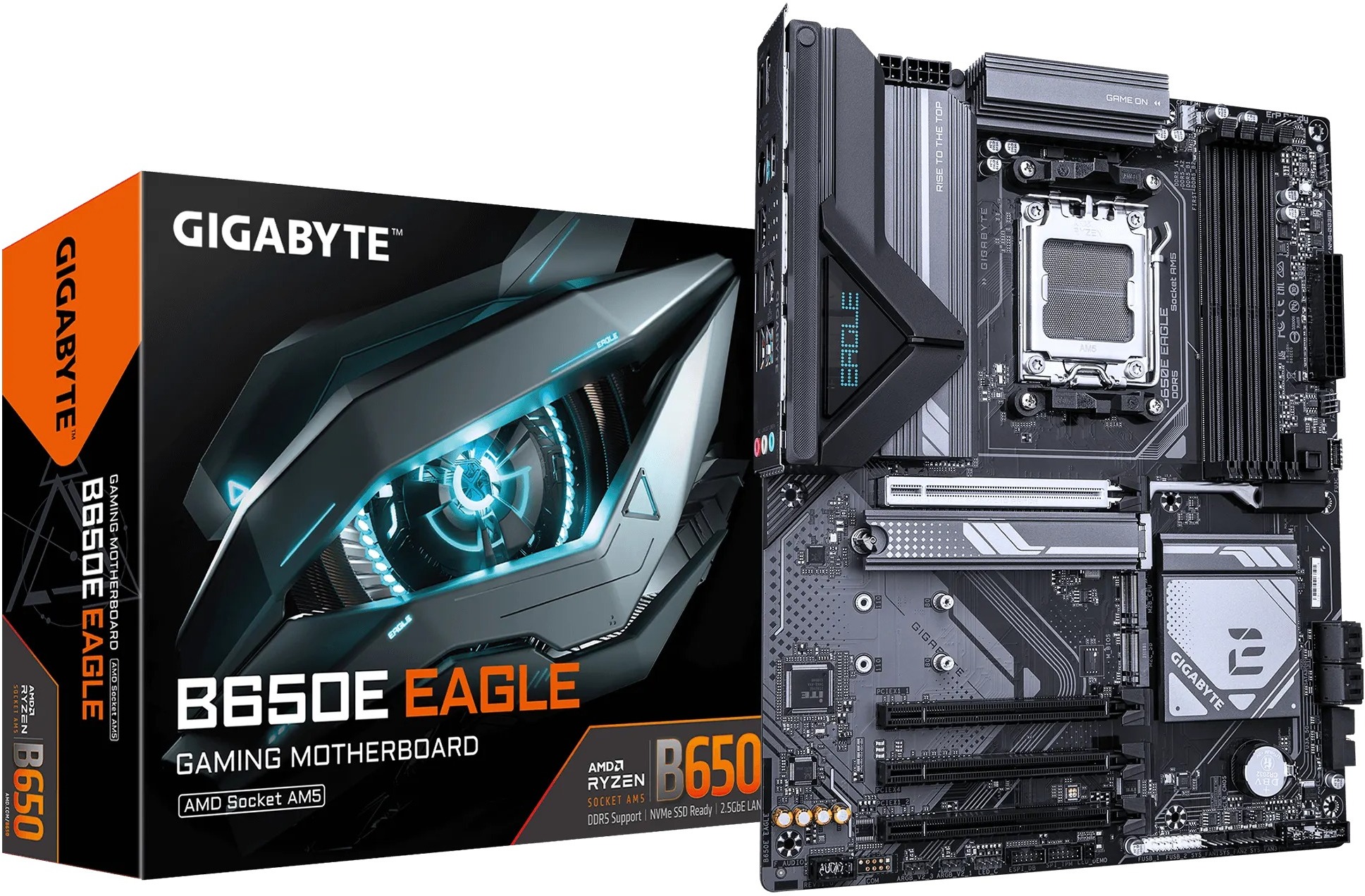Gigabyte B650E EAGLE — це надійна материнська плата формфактора ATX на чипсеті AMD B650E з сокетом AM5, призначена для процесорів AMD Ryzen 7000/8000/9000 серій. Вона ідеально підходить для геймерських і творчих систем завдяки підтримці DDR5-пам'яті та PCIe 5.0, що забезпечує високу продуктивність і сумісність з сучасними компонентами.