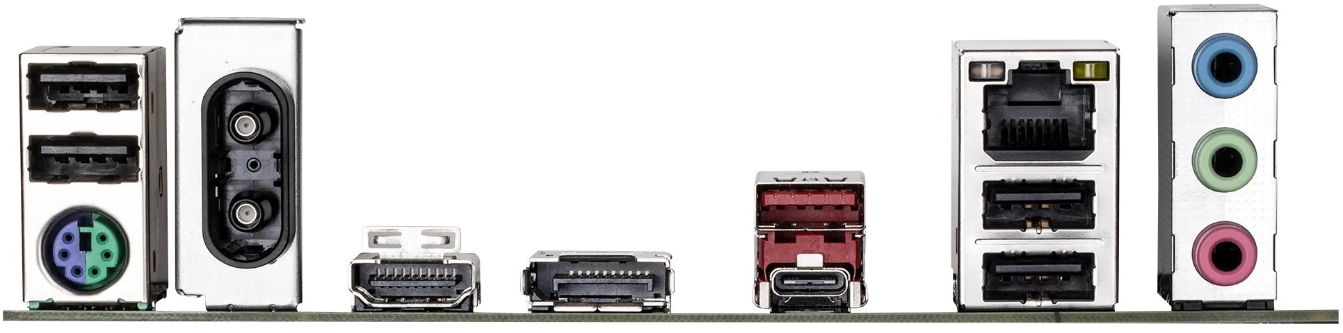 Для підключення периферії плата оснащена портами USB 3.2 Gen 2x2 Type-C (20 Гб/с), HDMI, DisplayPort і чотирма SATA 6 Гб/с. Мережевий контролер GbE LAN та модуль Wi-Fi 802.11ax із функцією керування пропускною здатністю забезпечує низьку затримку в іграх. Аудіосистема Hi-Fi з високоякісними конденсаторами та захистом від шумів гарантує чистий звук.