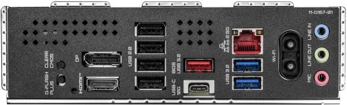 Для зберігання даних передбачено три слоти M.2 — два PCIe 4.0 x4 і один PCIe 3.0 — та чотири порти SATA 6 Гбіт/с. На задній панелі розташовані HDMI, DisplayPort, провідна мережа 2.5GbE LAN, а також порти USB 3.2 Gen 2, USB 3.2 Gen 1 Type-C і кілька USB 2.0. Бездротовий модуль Wi-Fi 6E використовує виділений діапазон 6 ГГц для стабільнішого з'єднання у щільно завантажених мережах, а антена під'єднується через зручний роз'єм WIFI EZ-Plug.