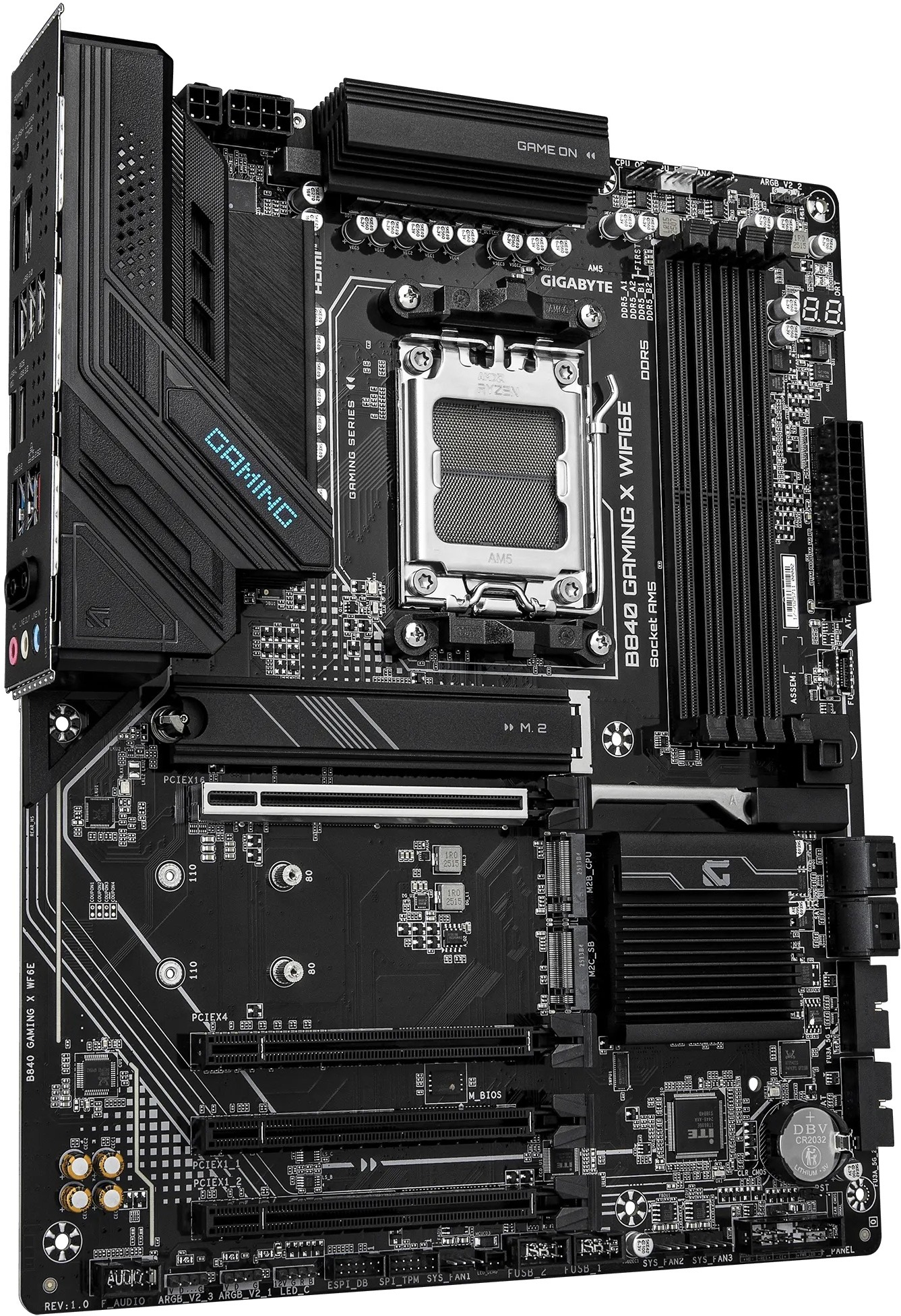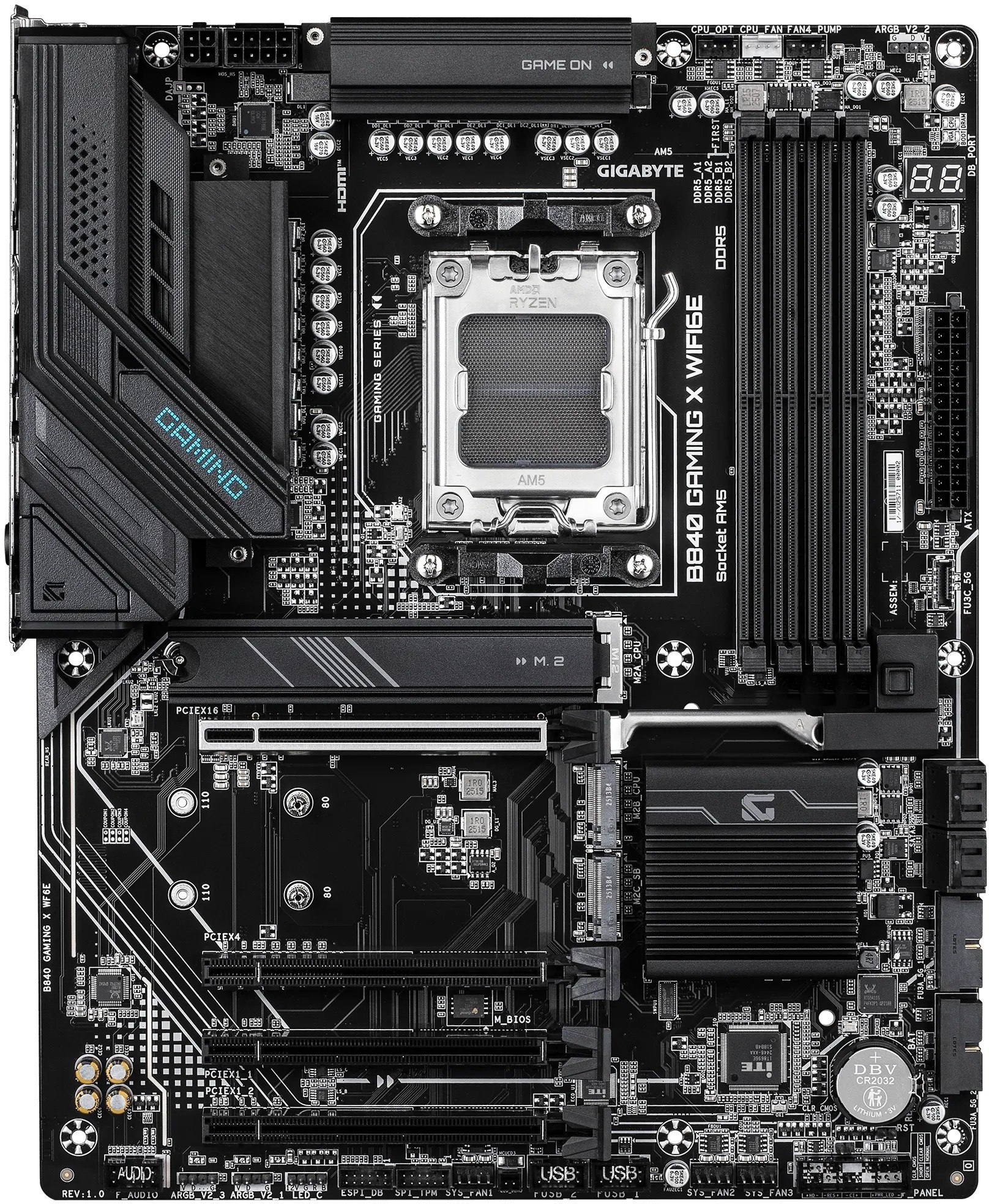 Gigabyte B840 GAMING X WIFI6E — повнорозмірна материнська плата форм-фактора ATX на платформі AMD Socket AM5, що належить до ігрової серії GAMING X і орієнтована на користувачів, яким важлива висока продуктивність, потужна схема живлення та широкий набір інтерфейсів. Плата підтримує процесори AMD Ryzen серій 9000, 8000 і 7000 та поєднує 12-фазну схему живлення, швидку пам'ять DDR5 і бездротову мережу Wi-Fi 6E в одному рішенні.