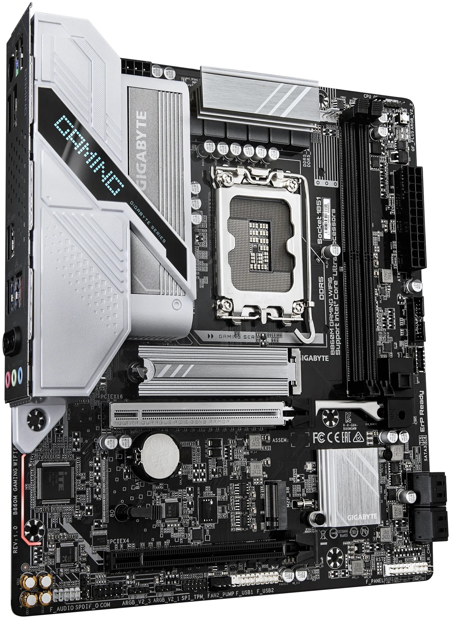 Gigabyte B860M GAMING WIFI6 — це сучасна материнська плата формату Micro ATX на чипсеті Intel B860, створена спеціально для процесорів Intel Core Ultra (Series 2) з сокетом LGA 1851. Вона ідеально підходить для компактних ігрових та універсальних систем, поєднуючи хороший набір можливостей розгону пам’яті, швидкісний інтерфейс та вбудований Wi-Fi 6.